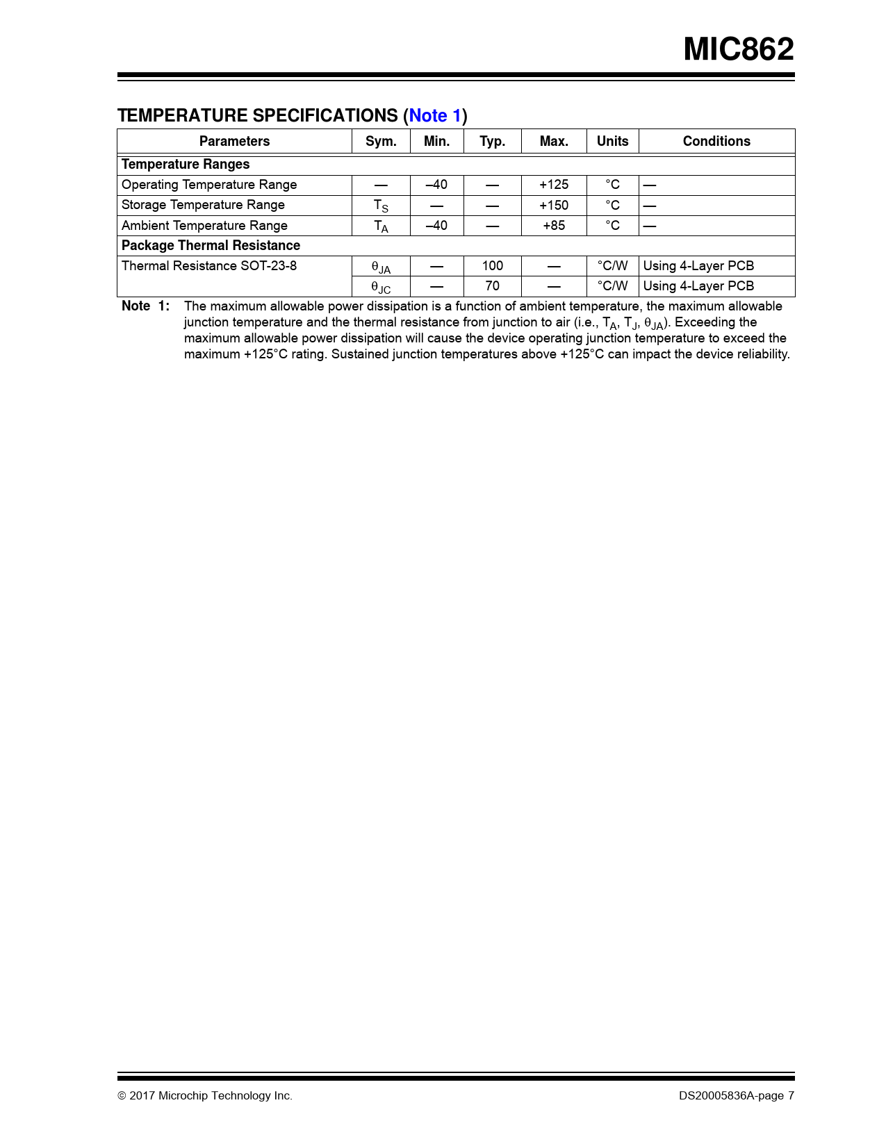 link to page 7 MIC862TEMPERATURE SPECIFICATIONS (Note 1)ParametersSym.Min.Typ.Max.UnitsConditionsTemperature Ranges Operating Temperature Range — –40 — +125 °C — Storage Temperature Range TS — — +150 °C — Ambient Temperature Range TA –40 — +85 °C — Package Thermal Resistance Thermal Resistance SOT-23-8 JA — 100 — °C/W Using 4-Layer PCB JC — 70 — °C/W Using 4-Layer PCB Note 1: The maximum allowable power dissipation is a function of ambient temperature, the maximum allowable junction temperature and the thermal resistance from junction to air (i.e., TA, TJ, JA). Exceeding the maximum allowable power dissipation will cause the device operating junction temperature to exceed the maximum +125°C rating. Sustained junction temperatures above +125°C can impact the device reliability. 2017 Microchip Technology Inc. DS20005836A-page 7 Document Outline 1.0 Electrical Characteristics 2.0 Typical Performance Curves 3.0 Pin Descriptions 4.0 Application Information 4.1 Power Supply Bypassing 4.2 Supply and Loading Resistive Considerations 4.3 Capacitive Load 5.0 Packaging Information 5.1 Package Marking Information Appendix A: Revision History Product Identification System Worldwide Sales and Service