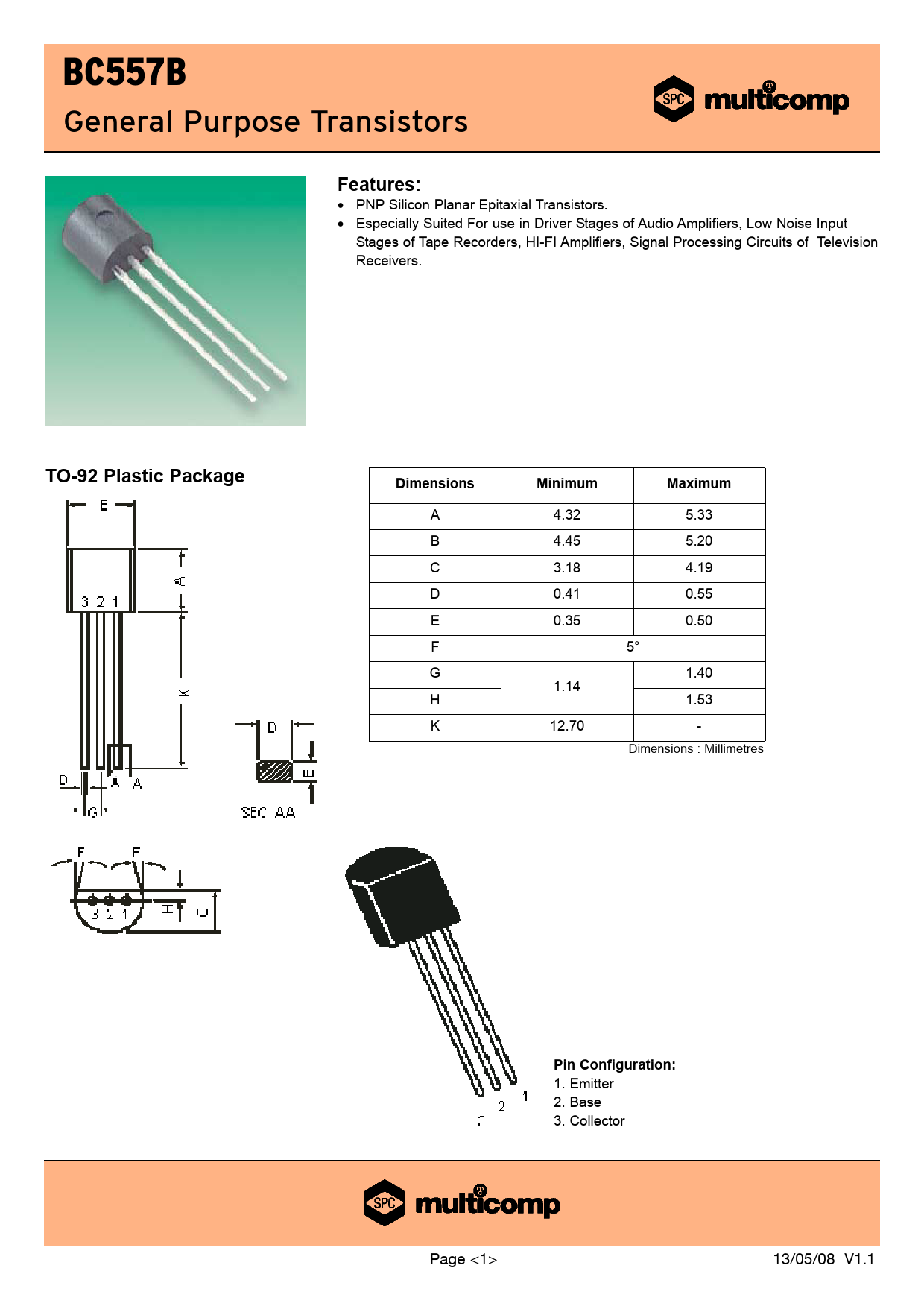 Features:. TO-92 Plastic Package. Dimensions. Minimum. Maximum. Pin Configuration: