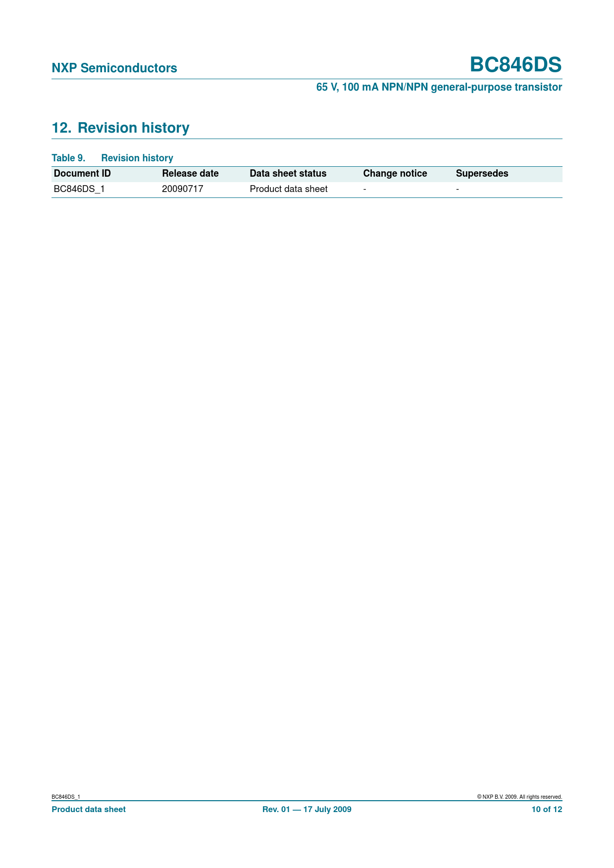 NXP Semiconductors. BC846DS. 65 V, 100 mA NPN/NPN general-purpose transistor. 12. Revision history. Table 9. Revision history