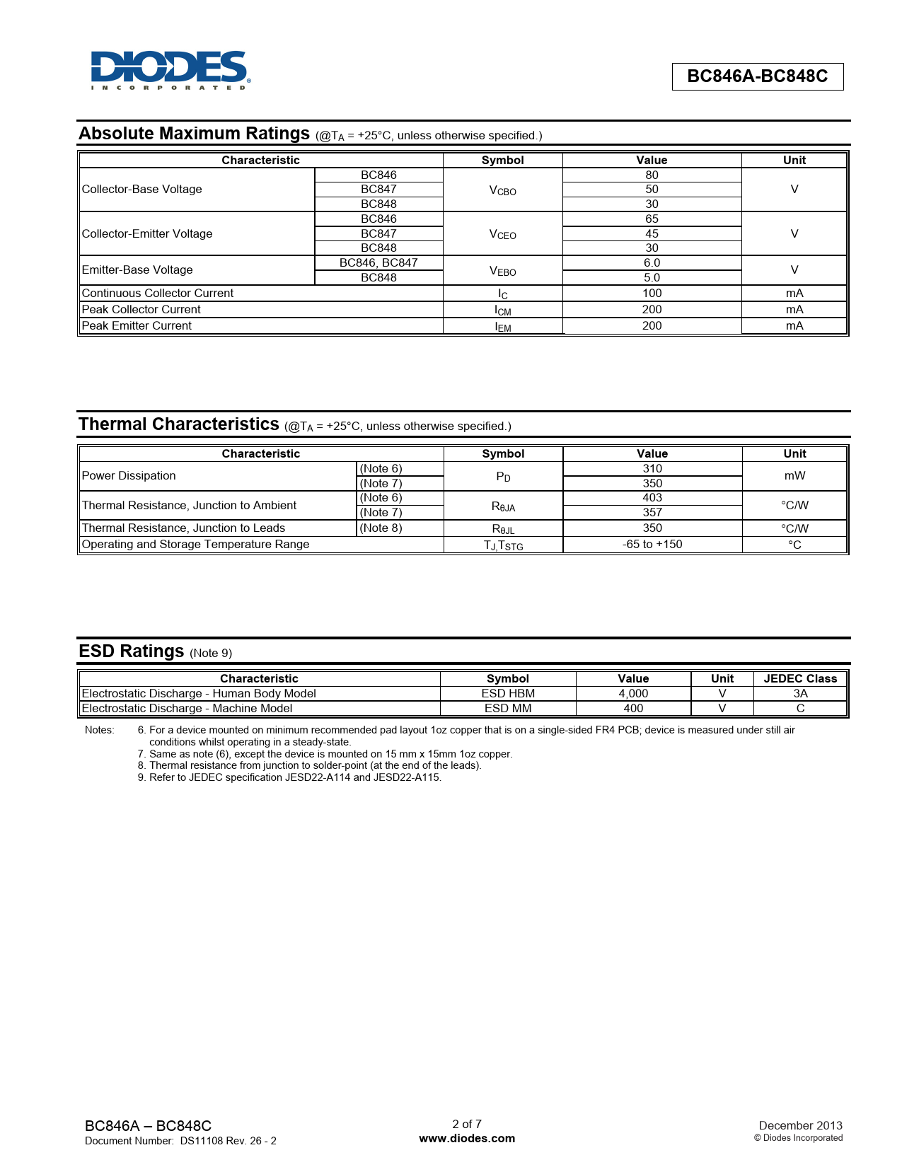 BC846A-BC848C. Absolute Maximum Ratings. Characteristic Symbol. Value. Unit. Thermal Characteristics. ESD Ratings. JEDEC. Class