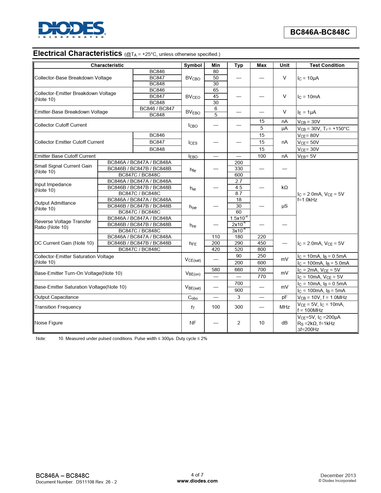 BC846A-BC848C. Electrical Characteristics. Characteristic Symbol. Min. Typ. Max. Unit. Test. Condition. www.diodes.com