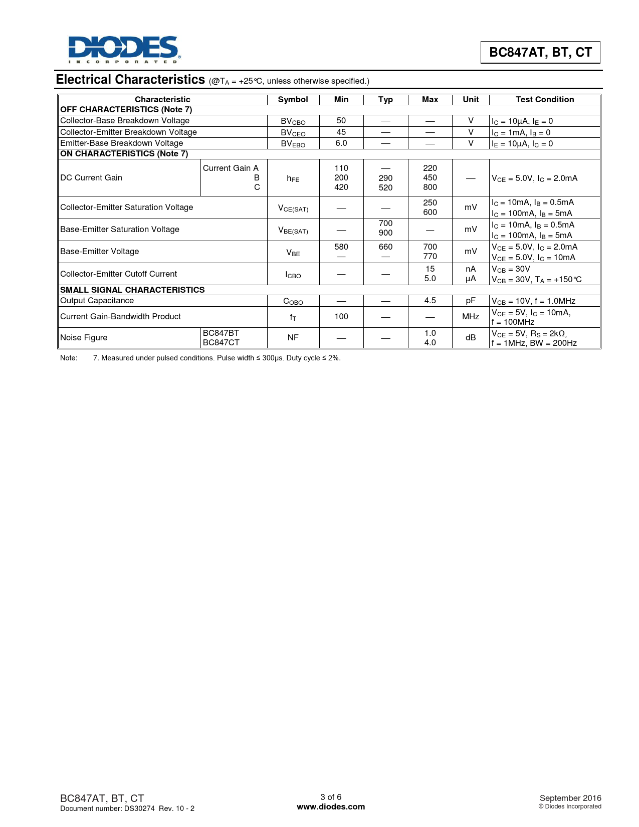 BC847AT, BT, CT. Electrical Characteristics. Characteristic. Symbol. Min. Typ. Max. Unit. Test Condition. OFF CHARACTERISTICS (Note 7)