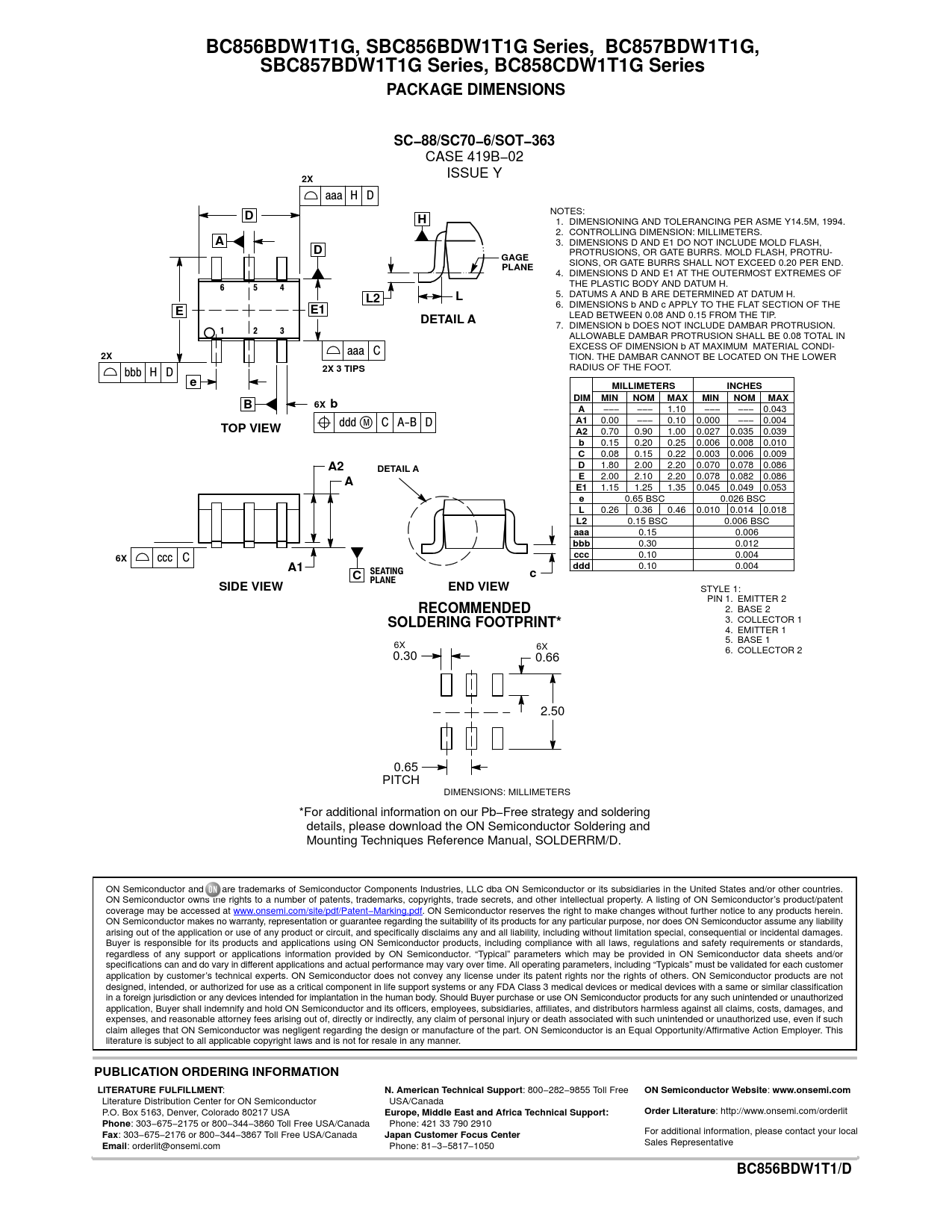 BC856BDW1T1G, SBC856BDW1T1G Series, BC857BDW1T1G,SBC857BDW1T1G Series, BC858CDW1T1G SeriesPACKAGE DIMENSIONSSC−88/SC70−6/SOT−363 CASE 419B−02 ISSUE Y 2X aaa H D NOTES: DH 1. DIMENSIONING AND TOLERANCING PER ASME Y14.5M, 1994. 2. CONTROLLING DIMENSION: MILLIMETERS. A 3. DIMENSIONS D AND E1 DO NOT INCLUDE MOLD FLASH, D PROTRUSIONS, OR GATE BURRS. MOLD FLASH, PROTRU- GAGE SIONS, OR GATE BURRS SHALL NOT EXCEED 0.20 PER END. PLANE 4. DIMENSIONS D AND E1 AT THE OUTERMOST EXTREMES OF THE PLASTIC BODY AND DATUM H. 654 5. DATUMS A AND B ARE DETERMINED AT DATUM H. L2L 6. DIMENSIONS b AND c APPLY TO THE FLAT SECTION OF THE EE1 LEAD BETWEEN 0.08 AND 0.15 FROM THE TIP. DETAIL A 7. DIMENSION b DOES NOT INCLUDE DAMBAR PROTRUSION. 123 ALLOWABLE DAMBAR PROTRUSION SHALL BE 0.08 TOTAL IN EXCESS OF DIMENSION b AT MAXIMUM MATERIAL CONDI- aaa C 2X TION. THE DAMBAR CANNOT BE LOCATED ON THE LOWER 2X 3 TIPS RADIUS OF THE FOOT. bbb H D eMILLIMETERSINCHESDIMMINNOMMAXMINNOMMAXB6X bA −−− −−− 1.10 −−− −−− 0.043 ddd M C A1 0.00 −−− 0.10 0.000 −−− 0.004 A-B D TOP VIEWA2 0.70 0.90 1.00 0.027 0.035 0.039 b 0.15 0.20 0.25 0.006 0.008 0.010 C 0.08 0.15 0.22 0.003 0.006 0.009 D 1.80 2.00 2.20 0.070 0.078 0.086 A2DETAIL AAE 2.00 2.10 2.20 0.078 0.082 0.086 E1 1.15 1.25 1.35 0.045 0.049 0.053 e 0.65 BSC 0.026 BSC L 0.26 0.36 0.46 0.010 0.014 0.018 L2 0.15 BSC 0.006 BSC aaa 0.15 0.006 bbb 0.30 0.012 ccc 0.10 0.004 6X ccc C A1ddd 0.10 0.004 SEATINGCcPLANESIDE VIEWEND VIEW STYLE 1: PIN 1. EMITTER 2 RECOMMENDED 2. BASE 2 3. COLLECTOR 1 SOLDERING FOOTPRINT* 4. EMITTER 1 5. BASE 1 6X 6X 6. COLLECTOR 2 0.30 0.66 2.50 0.65 PITCH DIMENSIONS: MILLIMETERS *For additional information on our Pb−Free strategy and soldering details, please download the ON Semiconductor Soldering and Mounting Techniques Reference Manual, SOLDERRM/D. ON Semiconductor and are trademarks of Semiconductor Components Industries, LLC dba ON Semiconductor or its subsidiaries in the United States and/or other countries. ON Semiconductor owns the rights to a number of patents, trademarks, copyrights, trade secrets, and other intellectual property. A listing of ON Semiconductor’s product/patent coverage may be accessed at www.onsemi.com/site/pdf/Patent−Marking.pdf. ON Semiconductor reserves the right to make changes without further notice to any products herein. ON Semiconductor makes no warranty, representation or guarantee regarding the suitability of its products for any particular purpose, nor does ON Semiconductor assume any liability arising out of the application or use of any product or circuit, and specifically disclaims any and all liability, including without limitation special, consequential or incidental damages. Buyer is responsible for its products and applications using ON Semiconductor products, including compliance with all laws, regulations and safety requirements or standards, regardless of any support or applications information provided by ON Semiconductor. “Typical” parameters which may be provided in ON Semiconductor data sheets and/or specifications can and do vary in different applications and actual performance may vary over time. All operating parameters, including “Typicals” must be validated for each customer application by customer’s technical experts. ON Semiconductor does not convey any license under its patent rights nor the rights of others. ON Semiconductor products are not designed, intended, or authorized for use as a critical component in life support systems or any FDA Class 3 medical devices or medical devices with a same or similar classification in a foreign jurisdiction or any devices intended for implantation in the human body. Should Buyer purchase or use ON Semiconductor products for any such unintended or unauthorized application, Buyer shall indemnify and hold ON Semiconductor and its officers, employees, subsidiaries, affiliates, and distributors harmless against all claims, costs, damages, and expenses, and reasonable attorney fees arising out of, directly or indirectly, any claim of personal injury or death associated with such unintended or unauthorized use, even if such claim alleges that ON Semiconductor was negligent regarding the design or manufacture of the part. ON Semiconductor is an Equal Opportunity/Affirmative Action Employer. This literature is subject to all applicable copyright laws and is not for resale in any manner. PUBLICATION ORDERING INFORMATIONLITERATURE FULFILLMENT : N. American Technical Support : 800−282−9855 Toll Free ON Semiconductor Website : www.onsemi.com Literature Distribution Center for ON Semiconductor USA/Canada P.O. Box 5163, Denver, Colorado 80217 USA Europe, Middle East and Africa Technical Support:Order Literature : http://www.onsemi.com/orderlit Phone : 303−675−2175 or 800−344−3860 Toll Free USA/Canada Phone: 421 33 790 2910 Fax : 303−675−2176 or 800−344−3867 Toll Free USA/Canada Japan Customer Focus Center For additional information, please contact your local Email : orderlit@onsemi.com Phone: 81−3−5817−1050 Sales Representative www.onsemi.comBC856BDW1T1/D7