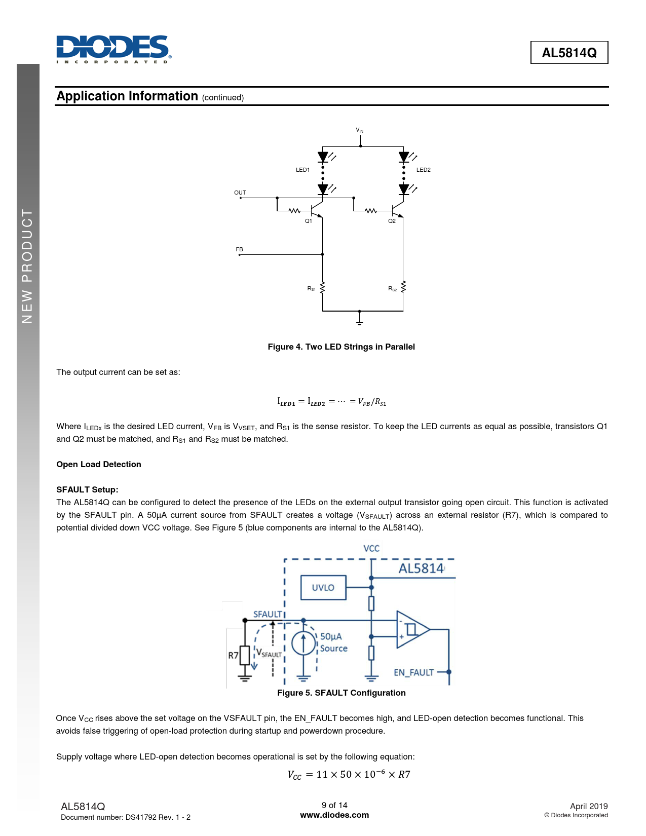 Once VCC rises above the set voltage on the VSFAULT pin, the EN_FAULT becomes high, and LED-open detection becomes functional. This avoids false triggering of open-load protection during startup and powerdown procedure. Supply voltage where LED-open detection becomes operational is set by the following equation: 𝑉𝐶𝐶 = 11 × 50 × 10−6 × 𝑅7 AL5814Q 9 of 14 April 2019 Document number: DS41792 Rev. 1 - 2