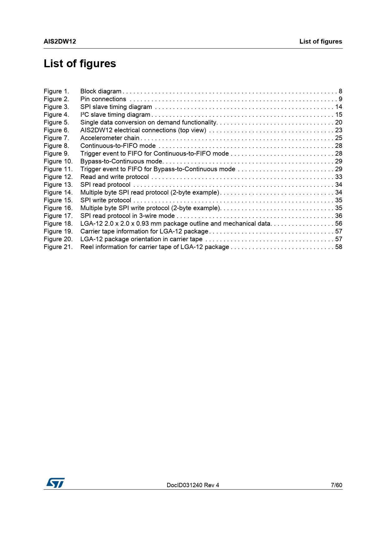 Figure 1. Block diagram . 8 Figure 2. Pin connections . 9 Figure 3. SPI slave timing diagram . 14 Figure 4. I²C slave timing diagram . 15 Figure 5. Single data conversion on demand functionality. 20 Figure 6. AIS2DW12 electrical connections (top view) . 23 Figure 7. Accelerometer chain . 25 Figure 8. Continuous-to-FIFO mode . 28 Figure 9. Trigger event to FIFO for Continuous-to-FIFO mode . 28 Figure 10. Bypass-to-Continuous mode. 29 Figure 11. Trigger event to FIFO for Bypass-to-Continuous mode . 29 Figure 12. Read and write protocol . 33 Figure 13. SPI read protocol . 34 Figure 14. Multiple byte SPI read protocol (2-byte example) . 34 Figure 15. SPI write protocol . 35 Figure 16. Multiple byte SPI write protocol (2-byte example). 35 Figure 17. SPI read protocol in 3-wire mode . 36 Figure 18. LGA-12 2.0 x 2.0 x 0.93 mm package outline and mechanical data. 56 Figure 19. Carrier tape information for LGA-12 package . 57 Figure 20. LGA-12 package orientation in carrier tape . 57 Figure 21. Reel information for carrier tape of LGA-12 package . 58 DocID031240 Rev 4 7/60 60 Document Outline Table 1. Device summary 1 Block diagram and pin description 1.1 Block diagram Figure 1. Block diagram 1.2 Pin description Figure 2. Pin connections Table 2. Pin description Table 3. Internal pull-up values (typ.) for SDO/SA0 and CS pins 2 Mechanical and electrical specifications 2.1 Mechanical characteristics Table 4. Mechanical characteristics @ Vdd = 3.0 V, T = -40°C to +85°C unless otherwise noted 2.2 Electrical characteristics Table 5. Electrical characteristics @ Vdd = 3.0 V, T = -40°C to +85°C unless otherwise noted 2.3 Temperature sensor characteristics Table 6. Temperature sensor characteristics 2.4 Communication interface characteristics 2.4.1 SPI - serial peripheral interface Table 7. SPI slave timing values Figure 3. SPI slave timing diagram 2.4.2 I²C - inter-IC control interface Table 8. I²C slave timing values Figure 4. I²C slave timing diagram Table 9. I²C high-speed mode specifications at 1 MHz and 3.4 MHz 2.5 Absolute maximum ratings Table 10. Absolute maximum ratings 3 Terminology and functionality 3.1 Terminology 3.1.1 Sensitivity 3.1.2 Zero-g level offset 3.2 Functionality 3.2.1 Operating modes Table 11. Operating modes 3.2.2 Single data conversion on-demand mode Figure 5. Single data conversion on demand functionality 3.2.3 Self-test 3.2.4 Activity/Inactivity, stationary/motion detection functions 3.2.5 Offset management 3.3 Sensing element 3.4 IC interface 3.5 Factory calibration 3.6 Temperature sensor 4 Application hints Figure 6. AIS2DW12 electrical connections (top view) Table 12. Internal pin status 5 Digital main blocks 5.1 Block diagram of filters Figure 7. Accelerometer chain 5.2 FIFO 5.2.1 Bypass mode 5.2.2 FIFO mode 5.2.3 Continuous mode 5.2.4 Continuous-to-FIFO mode Figure 8. Continuous-to-FIFO mode Figure 9. Trigger event to FIFO for Continuous-to-FIFO mode 5.2.5 Bypass-to-Continuous mode Figure 10. Bypass-to-Continuous mode Figure 11. Trigger event to FIFO for Bypass-to-Continuous mode 6 Digital interfaces Table 13. Serial interface pin description 6.1 I²C serial interface Table 14. I²C terminology 6.1.1 I2C operation Table 15. SAD+Read/Write patterns Table 16. Transfer when master is writing one byte to slave Table 17. Transfer when master is writing multiple bytes to slave Table 18. Transfer when master is receiving (reading) one byte of data from slave Table 19. Transfer when master is receiving (reading) multiple bytes of data from slave 6.2 SPI bus interface Figure 12. Read and write protocol 6.2.1 SPI read Figure 13. SPI read protocol Figure 14. Multiple byte SPI read protocol (2-byte example) 6.2.2 SPI write Figure 15. SPI write protocol Figure 16. Multiple byte SPI write protocol (2-byte example) 6.2.3 SPI read in 3-wire mode Figure 17. SPI read protocol in 3-wire mode 7 Register mapping Table 20. Register map 8 Register description 8.1 OUT_T_L (0Dh) Table 21. OUT_T_L register Table 22. OUT_T_L register description 8.2 OUT_T_H (0Eh) Table 23. OUT_T_H register Table 24. OUT_T_H register description 8.3 WHO_AM_I (0Fh) Table 25. WHO_AM_I register default values 8.4 CTRL1 (20h) Table 26. Control register 1 Table 27. Control register 1 description Table 28. Data rate configuration Table 29. Operating mode selection Table 30. Power mode selection 8.5 CTRL2 (21h) Table 31. Control register 2 Table 32. Control register 2 description 8.6 CTRL3 (22h) Table 33. Control register 3 Table 34. Control register 3 description Table 35. Self-test mode selection 8.7 CTRL4_INT1 (23h) Table 36. Control register 4 Table 37. Control register 4 description 8.8 CTRL5_INT2 (24h) Table 38. Control register 5 Table 39. Control register 5 description 8.9 CTRL6 (25h) Table 40. Control register 6 Table 41. Control register 6 description Table 42. Digital filtering cutoff selection (FDS bit set to ‘0’) Table 43. LPF1 cutoff (FDS bit set to '0') Table 44. Digital high-pass filter cutoff selection (FDS bit set to ‘1’) Table 45. Full-scale selection 8.10 OUT_T (26h) Table 46. OUT_T register Table 47. OUT_T register description 8.11 STATUS (27h) Table 48. STATUS register Table 49. STATUS register description 8.12 OUT_X_L (28h) Table 50. OUT_X_L register 8.13 OUT_X_H (29h) Table 51. OUT_X_H register 8.14 OUT_Y_L (2Ah) Table 52. OUT_Y_L register 8.15 OUT_Y_H (2Bh) Table 53. OUT_Y_H register 8.16 OUT_Z_L (2Ch) Table 54. OUT_Z_L register 8.17 OUT_Z_H (2Dh) Table 55. OUT_Z_H register 8.18 FIFO_CTRL (2Eh) Table 56. FIFO_CTRL register Table 57. FIFO_CTRL register description Table 58. FIFO mode selection 8.19 FIFO_SAMPLES (2Fh) Table 59. FIFO_SAMPLES register Table 60. FIFO_SAMPLES register description 8.20 SIXD_THS (30h) Table 61. SIXD_THS register Table 62. SIXD_THS register description Table 63. 4D/6D threshold setting FS @ ±2 g 8.21 WAKE_UP_THS (34h) Table 64. WAKE_UP_THS register Table 65. WAKE_UP_THS register description 8.22 WAKE_UP_DUR (35h) Table 66. WAKE_UP_DUR register Table 67. 