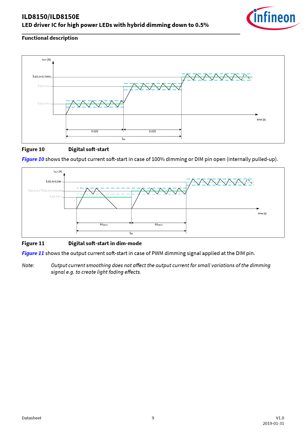shows the output current soft-start in case of PWM dimming signal applied at the DIM pin. Note: Output current smoothing does not affect the output current for small variations of the dimming signal e.g. to create light fading effects. Datasheet 9 V1.0 2019-01-31 Document Outline Features Potential applications Description Table of contents 1 Functional block diagram 2 Pin configuration 3 Functional description 3.1 Buck controller features 3.1.1 Output current regulation 3.1.2 Dimming 3.1.3 Digital soft-start 3.1.4 Low power mode 3.2 Protection features 3.2.1 Over-temperature protection 3.2.2 Under-voltage protection 4 Thermal and electrical characteristics 4.1 Package characteristics 4.2 Absolute maximum ratings 4.3 Operating conditions 4.4 Electrical characteristics 5 Package dimensions Disclaimer