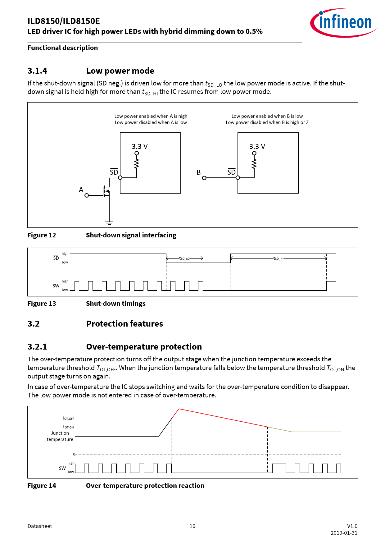 The over-temperature protection turns off the output stage when the junction temperature exceeds the temperature threshold TOT,OFF. When the junction temperature falls below the temperature threshold TOT,ON the output stage turns on again. In case of over-temperature the IC stops switching and waits for the over-temperature condition to disappear. The low power mode is not entered in case of over-temperature. tOT,OFF tOT,ON Junction temperature 0 high SW low