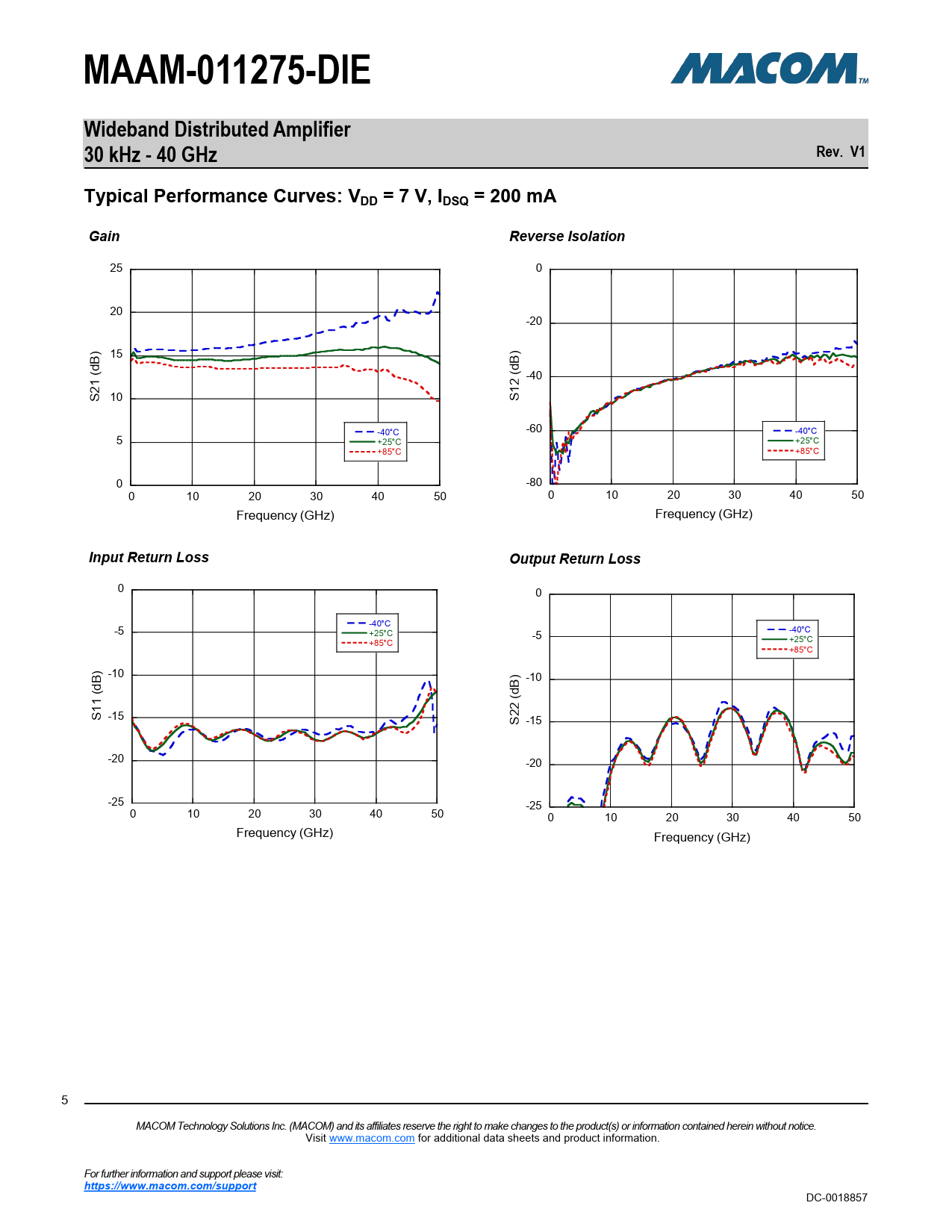 MAAM-011275-DIE. Wideband Distributed Amplifier. 30 kHz - 40 GHz. Rev. V1. Typical Performance Curves: VDD = 7 V, IDSQ = 200 mA