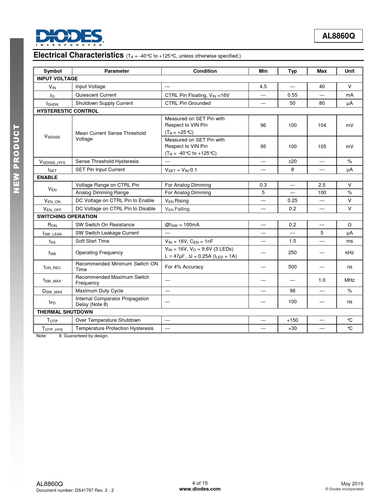 AL8860Q. Electrical Characteristics. Symbol. Parameter. Condition. Min. Typ. Max. Unit. INPUT VOLTAGE. HYSTERESTIC CONTROL. R P. ENABLE