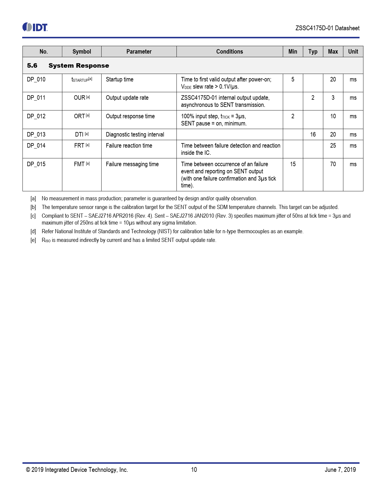 DP_010 tSTARTUP[a] Startup time Time to first valid output after power-on; 5 20 ms VDDE slew rate > 0.1V/µs. DP_011 OUR [a] Output update rate ZSSC4175D-01 internal output update, 2 3 ms asynchronous to SENT transmission. DP_012 ORT [a] Output response time 100% input step, tTICK = 3µs, 2 10 ms SENT pause = on, minimum. DP_013 DTI [a] Diagnostic testing interval 16 20 ms DP_014 FRT [a] Failure reaction time Time between failure detection and reaction 25 ms inside the IC. DP_015 FMT [a] Failure messaging time Time between occurrence of an failure 15 70 ms event and reporting on SENT output (with one failure confirmation and 3µs tick time). [a] No measurement in mass production; parameter is guaranteed by design and/or quality observation. [b] The temperature sensor range is the calibration target for the SENT output of the SDM temperature channels. This target can be adjusted. [c] Compliant to SENT – SAEJ2716 APR2016 (Rev. 4). Sent – SAEJ2716 JAN2010 (Rev. 3) specifies maximum jitter of 50ns at tick time = 3µs and maximum jitter of 250ns at tick time = 10µs without any sigma limitation. [d] Refer National Institute of Standards and Technology (NIST) for calibration table for n-type thermocouples as an example. [e] RISO is measured indirectly by current and has a limited SENT output update rate. © 2019 Integrated Device Technology, Inc. 10 June 7, 2019 Document Outline 1. Pin Assignments 2. Pin Descriptions 3. Absolute Maximum Ratings 4. Operating Conditions 5. Electrical Characteristics 6. Interface Characteristics and Nonvolatile Memory 7. Circuit Description 7.1 General Operation Description 7.2 Signal Path 7.3 Signal Conditioning 7.3.1 Thermocouple Sensor Signal Conditioning 7.3.2 Internal Temperature Sensor Signal Conditioning 7.4 Analog Front-End 7.4.1 Overview 7.4.2 SCCM 7.4.3 Input Multiplexer 7.4.4 Programmable Gain Amplifier 7.4.5 Analog-to-Digital Converter 7.5 Signal Measurement 7.5.1 Thermocouple Element Measurement 7.5.2 Internal Temperature Measurement 7.5.3 Isolation Conductance Measurement (Giso) 7.5.4 Thermocouple Resistor Measurement (Ropen) 7.5.5 Measurement Cycle 7.6 SENT Output 7.6.1 Overview 7.6.2 SENT Fast Channel Modes and Frame Format 7.6.3 SENT SDM Channel Modes 7.6.4 SENT Output Operation Modes 7.6.5 SENT Pulse Shaping 7.7 NVM OEM Data Memory 7.8 Over-Voltage and Short-Circuit Protection 8. Fault-Safe Operation 8.1 Fault-Safe Operation Modes 8.2 Fault Messaging 8.2.1 Overview 8.2.2 SENT Fast Channel Fault Codes 8.2.3 SENT Status Bits 8.2.4 SENT SDM Channel Status Codes 8.2.5 Timing Definitions 9. Fault Checks 9.1 Overview 9.2 Hardware Fault Checks 9.3 Application Monitors 9.4 Transmission Fault Checks 10. Application Circuit and External Components 11. ESD Protection and EMC Specification 11.1 ESD Protection 11.2 Electromagnetic Emission 11.3 Conducted Susceptibility (DPI) 12. Reliability and RoHS Conformity 13. Package Outline Drawings 14. Marking Diagram 15. Glossary 16. Ordering Information 17. Revision History