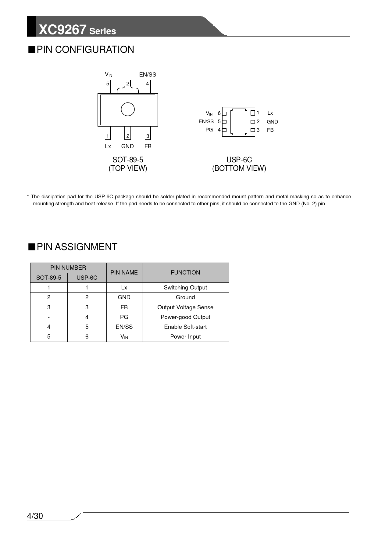 XC9267Series ■PIN CONFIGURATION V IN EN/SS 5 2 4 VIN 6 1 Lx EN/SS 5 2 GND PG 4 3 FB 1 2 3 Lx GND FB SOT-89-5 USP-6C (TOP VIEW) (BOTTOM VIEW) * The dissipation pad for the USP-6C package should be solder-plated in recommended mount pattern and metal masking so as to enhance mounting strength and heat release. If the pad needs to be connected to other pins, it should be connected to the GND (No. 2) pin. ■PIN ASSIGNMENT PIN NUMBER PIN NAME FUNCTION SOT-89-5 USP-6C 1 1 Lx Switching Output 2 2 GND Ground 3 3 FB Output Voltage Sense - 4 PG Power-good Output 4 5 EN/SS Enable Soft-start 5 6 VIN Power Input 4/30