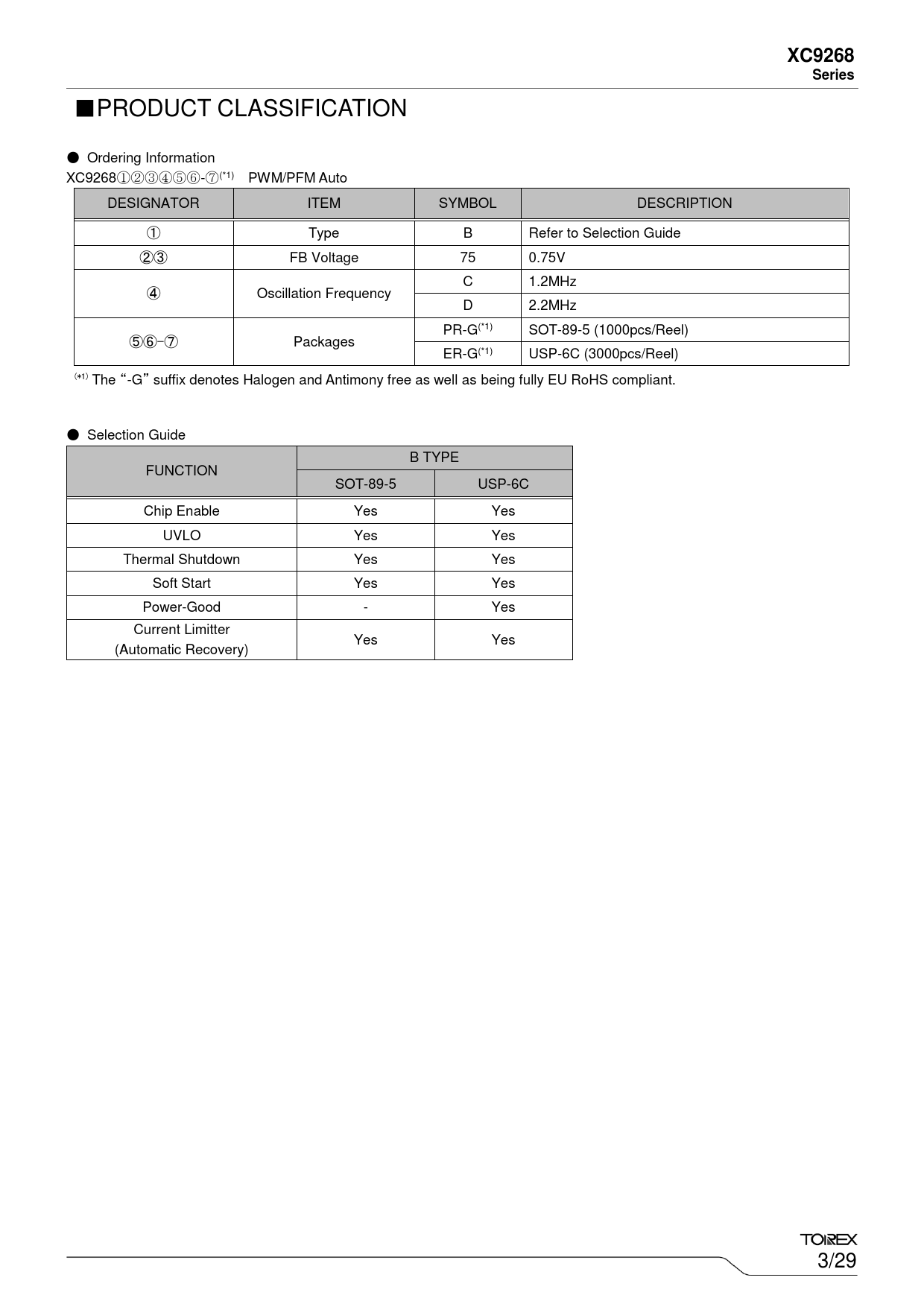 ■PRODUCT CLASSIFICATION ● Ordering Information XC9268①②③④⑤⑥-⑦(*1) PWM/PFM Auto DESIGNATOR ITEM SYMBOL DESCRIPTION ① Type B Refer to Selection Guide ②③ FB Voltage 75 0.75V C 1.2MHz ④ Oscillation Frequency D 2.2MHz PR-G(*1) SOT-89-5 (1000pcs/Reel) ⑤⑥-⑦ Packages ER-G(*1) USP-6C (3000pcs/Reel) (*1) The “-G” suffix denotes Halogen and Antimony free as well as being fully EU RoHS compliant. ● Selection Guide B TYPE FUNCTION SOT-89-5 USP-6C Chip Enable Yes Yes UVLO Yes Yes Thermal Shutdown Yes Yes Soft Start Yes Yes Power-Good - Yes Current Limitter Yes Yes (Automatic Recovery) 3/29