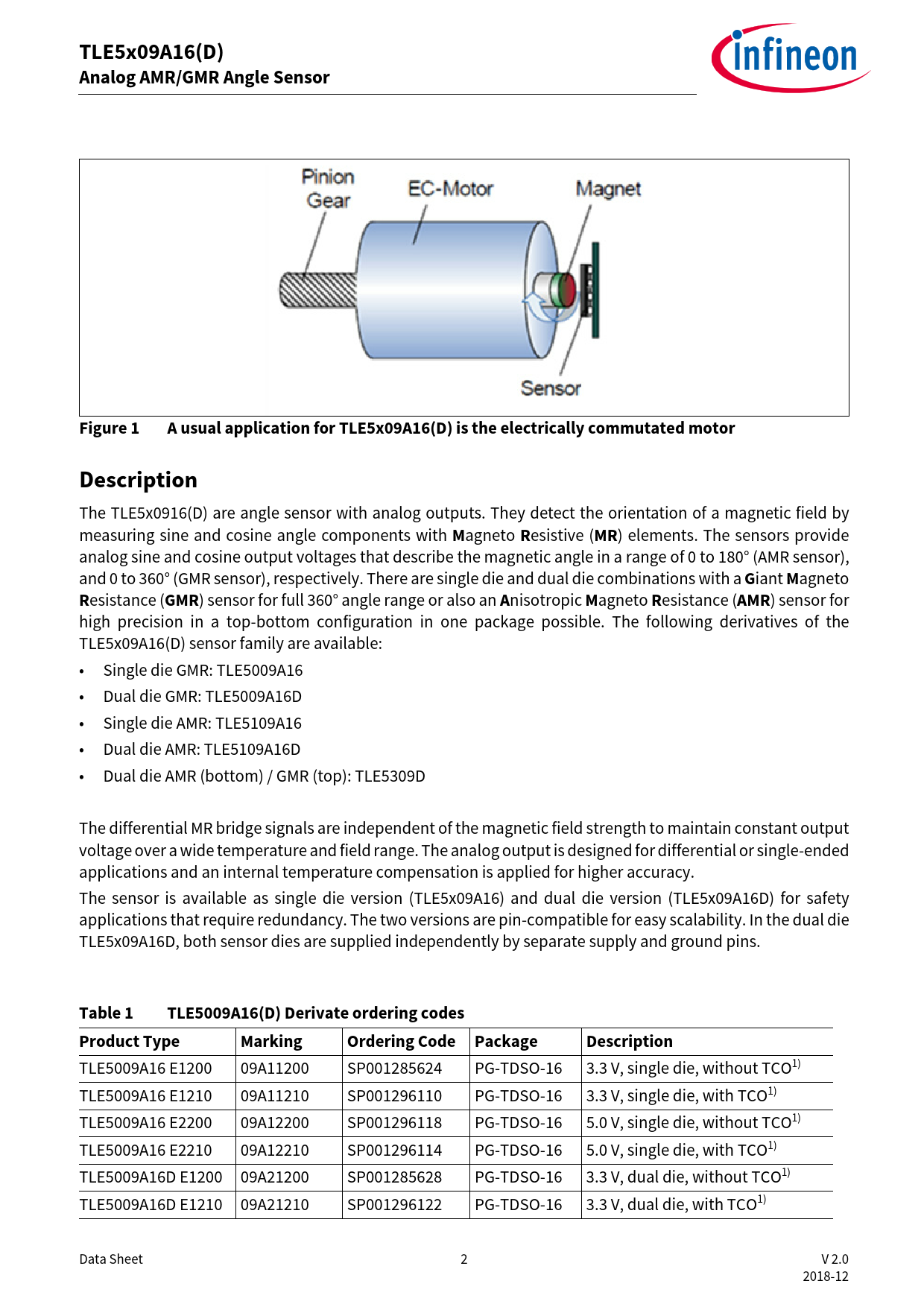 TLE5009A16 E1200 09A11200 SP001285624 PG-TDSO-16 3.3 V, single die, without TCO1) TLE5009A16 E1210 09A11210 SP001296110 PG-TDSO-16 3.3 V, single die, with TCO1) TLE5009A16 E2200 09A12200 SP001296118 PG-TDSO-16 5.0 V, single die, without TCO1) TLE5009A16 E2210 09A12210 SP001296114 PG-TDSO-16 5.0 V, single die, with TCO1) TLE5009A16D E1200 09A21200 SP001285628 PG-TDSO-16 3.3 V, dual die, without TCO1) TLE5009A16D E1210 09A21210 SP001296122 PG-TDSO-16 3.3 V, dual die, with TCO1) Data Sheet 2 V 2.0 2018-12 Document Outline Features Functional Safety Product Validation Potential Applications Description Table of Contents 1 Functional description 1.1 General 1.2 Pin configuration 1.3 Pin description 1.4 Block diagram 1.5 Dual die angle output 2 Specification 2.1 Application circuit 2.2 Absolute maximum ratings 2.3 Sensor specification 2.3.1 Operating range 2.3.2 Electrical parameters 2.3.3 Output parameters 2.4 Error diagnosis 2.5 Angle performance 2.6 Electrostatic discharge protection 2.7 Electro magnetic compatibility (EMC) 3 Package information 3.1 Package parameters 3.2 Package outlines 3.3 Footprint 3.4 Packing 3.5 Marking 4 Revision history