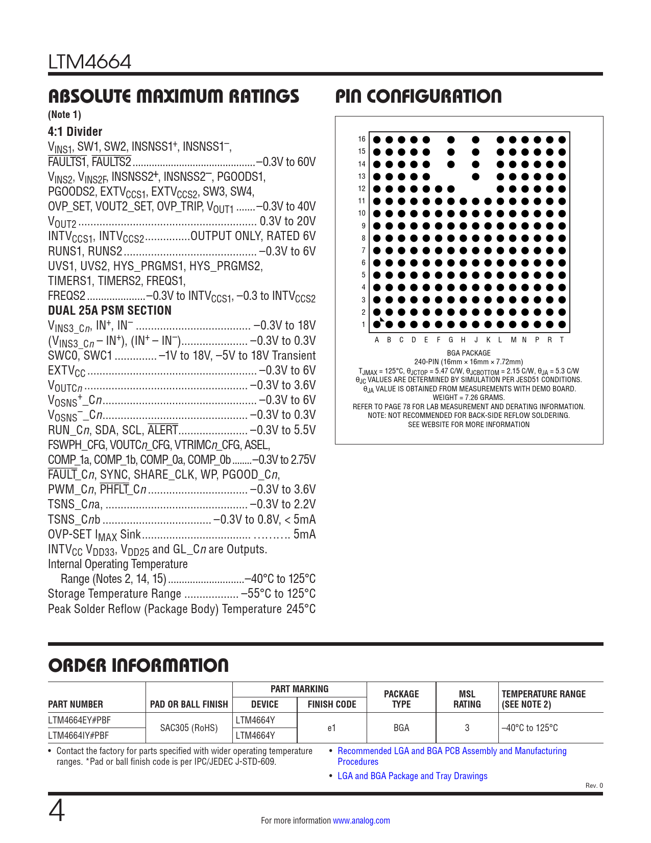 LTM4664 ABSOLUTE MAXIMUM RATINGSPIN CONFIGURATION(Note 1) 4:1 Divider V 16 INS1, SW1, SW2, INSNSS1+, INSNSS1–, 15 FAULTS1, FAULTS2 ...–0.3V to 60V 14 VINS2, VINS2F, INSNSS2+, INSNSS2–, PGOODS1, 13 PGOODS2, EXTVCCS1, EXTVCCS2, SW3, SW4, 12 OVP_SET, VOUT2_SET, OVP_TRIP, V 11 OUT1 ...–0.3V to 40V V 10 OUT2 ... 0.3V to 20V 9 INTVCCS1, INTVCCS2 ...OUTPUT ONLY, RATED 6V 8 RUNS1, RUNS2 .. –0.3V to 6V 7 UVS1, UVS2, HYS_PRGMS1, HYS_PRGMS2, 6 TIMERS1, TIMERS2, FREQS1, 5 4 FREQS2 ...–0.3V to INTVCCS1, –0.3 to INTVCCS2 3 DUAL 25A PSM SECTION 2 VINS3_Cn, IN+, IN– .. –0.3V to 18V 1 (VINS3_Cn – IN+), (IN+ – IN–).. –0.3V to 0.3V A B C D E F G H J K L M N P R T SWC0, SWC1 .. –1V to 18V, –5V to 18V Transient BGA PACKAGE 240-PIN (16mm × 16mm × 7.72mm) EXTVCC .. –0.3V to 6V TJMAX = 125°C, θJCTOP = 5.47 C/W, θJCBOTTOM = 2.15 C/W, θJA = 5.3 C/W V θJC VALUES ARE DETERMINED BY SIMULATION PER JESD51 CONDITIONS. OUTCn .. –0.3V to 3.6V θJA VALUE IS OBTAINED FROM MEASUREMENTS WITH DEMO BOARD. V + OSNS _Cn ... –0.3V to 6V WEIGHT = 7.26 GRAMS. REFER TO PAGE 78 FOR LAB MEASUREMENT AND DERATING INFORMATION. V – OSNS _Cn .. –0.3V to 0.3V NOTE: NOT RECOMMENDED FOR BACK-SIDE REFLOW SOLDERING. RUN_Cn, SDA, SCL, ALERT... –0.3V to 5.5V SEE WEBSITE FOR MORE INFORMATION FSWPH_CFG, VOUTCn_CFG, VTRIMCn_CFG, ASEL, COMP_1a, COMP_1b, COMP_0a, COMP_0b ..–0.3V to 2.75V FAULT_Cn, SYNC, SHARE_CLK, WP, PGOOD_Cn, PWM_Cn, PHFLT_Cn ... –0.3V to 3.6V TSNS_Cna, ... –0.3V to 2.2V TSNS_Cnb .. –0.3V to 0.8V, < 5mA OVP-SET IMAX Sink .. ………. 5mA INTVCC VDD33, VDD25 and GL_Cn are Outputs. Internal Operating Temperature Range (Notes 2, 14, 15) ..–40°C to 125°C Storage Temperature Range .. –55°C to 125°C Peak Solder Reflow (Package Body) Temperature 245°C ORDER INFORMATIONPART MARKINGPACKAGEMSLTEMPERATURE RANGEPART NUMBERPAD OR BALL FINISHDEVICEFINISH CODETYPERATING(SEE NOTE 2) LTM4664EY#PBF LTM4664Y SAC305 (RoHS) e1 BGA 3 –40°C to 125°C LTM4664IY#PBF LTM4664Y • Contact the factory for parts specified with wider operating temperature • Recommended LGA and BGA PCB Assembly and Manufacturing ranges. *Pad or ball finish code is per IPC/JEDEC J-STD-609. Procedures • LGA and BGA Package and Tray Drawings Rev. 0 4 For more information www.analog.com Document Outline Features Applications Typical Application Description Absolute Maximum Ratings Order Information Pin Configuration Electrical Characteristics Typical Performance Characteristics 4:1 Divider Block Diagram Dual 25A Power System Management (PSM) Block Diagram 4:1 Divider Operation 4:1 Divider Description Main Control INTVCCS1,2/EXTVCCS1,2 Power Start-Up and Shutdown Fault Protection and Thermal Shutdown High Side Current Sensing Frequency Selection Power Good and UV (PGOODSn and UVSn pins) Additional Overvoltage Protection 4:1 Divider Application Information Voltage Divider Pre-Balance Before Switching Overcurrent Protection Window Comparator Programming Effective Open Loop Output Resistance and Load Regulation Undervoltage Lockout Fault Response and Timer Programming Design Example Dual 25A PSM Operation PSM Section Overview, Major Features EEPROM with ECC Power-Up and Initialization Soft-Start Time-Based Sequencing Voltage-Based Sequencing Shutdown Light-Load Current Operation Switching Frequency and Phase PWM Loop Compensation Output Voltage Sensing INTVCC/EXTVCC Power Output Current Sensing and Sub Milliohm DCR Current Sensing Input Current Sensing PolyPhase Load Sharing External/Internal Temperature Sense RCONFIG (Resistor Configuration) Pins Fault Detection and Handling Status Registers and ALERT Masking Mapping Faults to FAULT Pins Power Good Pins CRC Protection Serial Interface Communication Protection Device Addressing Responses to VOUT and IIN/IOUT Faults Output Overvoltage Fault Response Output Undervoltage Response Peak Output Overcurrent Fault Response Responses to Timing Faults Responses to VIN OV Faults Responses to OT/UT Faults Internal Overtemperature Fault Response External Overtemperature and Undertemperature Fault Response Responses to Input Overcurrent and Output Undercurrent Faults Responses to External Faults Fault Logging Bus Timeout Protection Similarity Between PMBus, SMBus and I2C 2-Wire Interface PMBus Serial Digital Interface Figure 11 thru Figure 28 PMBus Protocols PMBus Command Summary PMBus Commands Dual 25A PSM Applications Information VIN to VOUT Step-Down Ratios Input Capacitors Output Capacitors Light Load Current Operation Switching Frequency and Phase Output Current Limit Programming Minimum On-Time Considerations Variable Delay Time, Soft-Start and Output Voltage Ramping Digital Servo Mode Soft Off (Sequenced Off) Undervoltage Lockout Fault Detection and Handling Open-Drain Pins Phase-Locked Loop and Frequency Synchronization Input Current Sense Amplifier Programmable Loop Compensation Checking Transient Response PolyPhase® Configuration Connecting the USB to I2C/SMBus/PMBus Controller to the LTM4664 In-System LTpowerPlay: An Interactive GUI for Digital Power PMBus Communication and Command Processing Thermal Considerations and Output Current Derating Table 10 and Table 11: Output Current Derating (Based on Demo Board) Dual 25A PSM Applications Information–Derating Curves EMI Performance Safety Considerations Layout Checklist/Example Typical Applications PMBus Command Details Addressing and Write Protect General Configuration Commands On/Off/Margin PWM Configuration Voltage Input Voltage and Limits Output Voltage and Limits Output Current and Limits Input Current and Limits Temperature External Temperature Calibration Timing Timing—On Sequence/Ramp Timing—Off Sequence/Ramp Precondition for Restart Fault Response Fault Responses All Faults Fault Responses Input Voltage Fault Responses Output Voltage Fault Responses Output Current Fault Responses IC Temperature Fault Responses External Temperature Fault Sharing Fault Sharing Propagation Fault Sharing Response Scratchpad I