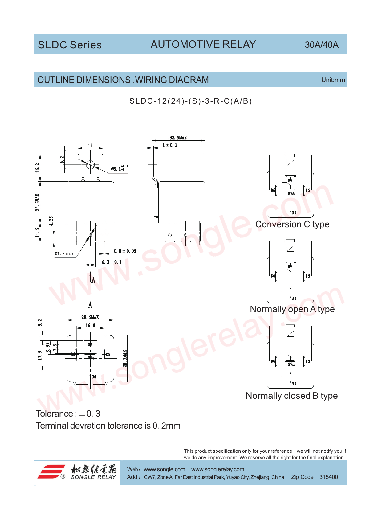 SLDC Series AUTOMOTIVE RELAY 30A/40A OUTLINE DIMENSIONS ,WIRING DIAGRAM Unit:mm S L D C - 1 2 ( 2 4 ) - ( S ) - 3 - R - C ( A / B ) Conversion C type Normally open A type Normally closed B type Tolerance:±0.3 Terminal devration tolerance is 0.2mm This product specification only for your reference, we will not notify you if we do any improvement.We reserve all the right for the final explanation Web:www.songle.com www.songlerelay.com Email:sale@songle.com Web:www.songle.com www.songlerelay.com Add.:CW7, Zone A, Far East Industrial Park, Yuyao City, Zhejiang, China i Z p Code:315400 Add.:CW7, Zone A, Far East Industrial Park, Yuyao City, Zhejiang, China Zip Code:315400 Tel.: +86 574 62717777 62762658 62721968 a F x:+86 574 62721978 Document Outline 页 1 页 2 页 3 页 4