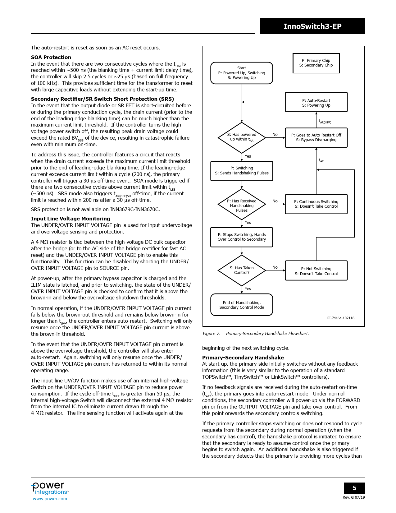 Yes The UNDER/OVER INPUT VOLTAGE pin is used for input undervoltage and overvoltage sensing and protection. P: Stops Switching, Hands Over Control to Secondary A 4 MΩ resistor is tied between the high-voltage DC bulk capacitor after the bridge (or to the AC side of the bridge rectifier for fast AC reset) and the UNDER/OVER INPUT VOLTAGE pin to enable this functionality. This function can be disabled by shorting the UNDER/ OVER INPUT VOLTAGE pin to SOURCE pin. S: Has Taken No P: Not Switching Control? S: Doesn’t Take Control At power-up, after the primary bypass capacitor is charged and the ILIM state is latched, and prior to switching, the state of the UNDER/ Yes OVER INPUT VOLTAGE pin is checked to confirm that it is above the brown-in and below the overvoltage shutdown thresholds. End of Handshaking, Secondary Control Mode In normal operation, if the UNDER/OVER INPUT VOLTAGE pin current fal s below the brown-out threshold and remains below brown-in for PI-7416a-102116 longer than t , the control er enters auto-restart. Switching will only UV- resume once the UNDER/OVER INPUT VOLTAGE pin current is above the brown-in threshold. Figure 7. Primary-Secondary Handshake Flowchart. In the event that the UNDER/OVER INPUT VOLTAGE pin current is above the overvoltage threshold, the control er will also enter beginning of the next switching cycle. auto-restart. Again, switching will only resume once the UNDER/