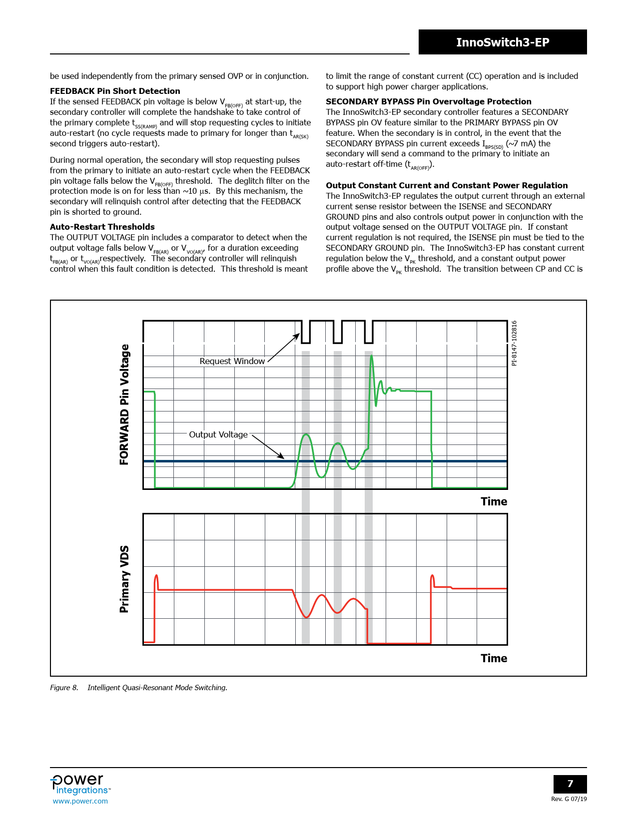 InnoSwitch3-EP be used independently from the primary sensed OVP or in conjunction. to limit the range of constant current (CC) operation and is included FEEDBACK Pin Short Detection to support high power charger applications. If the sensed FEEDBACK pin voltage is below V at start-up, the SECONDARY BYPASS Pin Overvoltage Protection FB(OFF) secondary control er will complete the handshake to take control of The InnoSwitch3-EP secondary control er features a SECONDARY the primary complete t and will stop requesting cycles to initiate BYPASS pin OV feature similar to the PRIMARY BYPASS pin OV SS(RAMP) auto-restart (no cycle requests made to primary for longer than t feature. When the secondary is in control, in the event that the AR(SK) second triggers auto-restart). SECONDARY BYPASS pin current exceeds I (~7 mA) the BPS(SD) secondary will send a command to the primary to initiate an During normal operation, the secondary will stop requesting pulses auto-restart off-time (t ). from the primary to initiate an auto-restart cycle when the FEEDBACK AR(OFF) pin voltage fal s below the V threshold. The deglitch filter on the FB(OFF) Output Constant Current and Constant Power Regulation protection mode is on for less than ~10 ms. By this mechanism, the The InnoSwitch3-EP regulates the output current through an external secondary will relinquish control after detecting that the FEEDBACK current sense resistor between the ISENSE and SECONDARY pin is shorted to ground. GROUND pins and also controls output power in conjunction with the Auto-Restart Thresholds output voltage sensed on the OUTPUT VOLTAGE pin. If constant The OUTPUT VOLTAGE pin includes a comparator to detect when the current regulation is not required, the ISENSE pin must be tied to the output voltage fal s below V or V , for a duration exceeding SECONDARY GROUND pin. The InnoSwitch3-EP has constant current FB(AR) VO(AR) t or t respectively. The secondary control er will relinquish regulation below the V threshold, and a constant output power FB(AR) VO(AR) PK control when this fault condition is detected. This threshold is meant profile above the V threshold. The transition between CP and CC is PK -8147-102816 Request Window PI Output Voltage FORWARD Pin VoltageTimePrimary VDSTime Figure 8. Intelligent Quasi-Resonant Mode Switching. 7 Rev. G 07/19 www.power.com Document Outline Product Highlights Description Output Power Table Pin Functional Description InnoSwitch3-EP Functional Description Primary Controller Secondary Controller Applications Example Key Application Considerations Selection of Components Components for InnoSwitch3-EP Primary-Side Circuit Components for InnoSwitch3-EP Secondary-Side Circuit Recommendations for Circuit Board Layout Layout Example Quick Design Checklist Absolute Maximum Ratings Thermal Resistance Typical Performance Curves InSOP-24D Package Drawing InSOP-24D Package Marking Part Ordering Table MSL Table ESD and Latch-Up Table Part Ordering Information