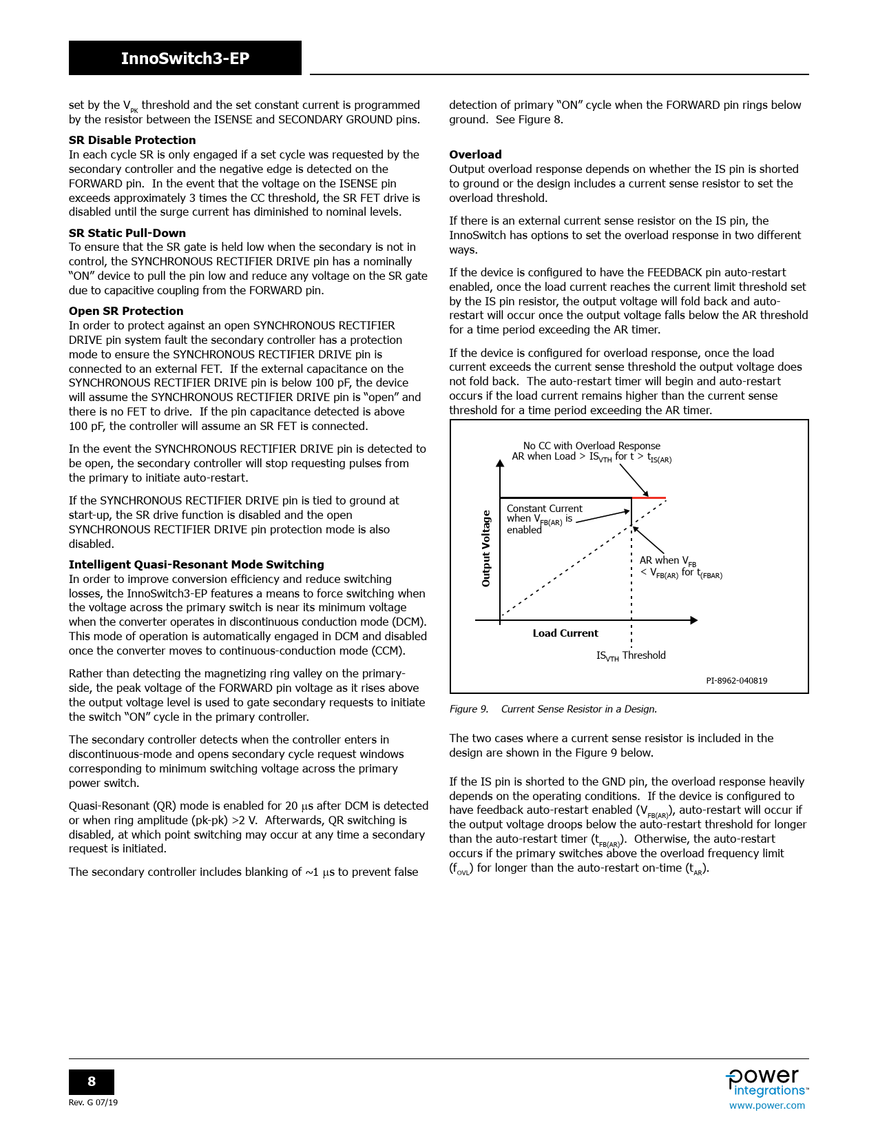 once the converter moves to continuous-conduction mode (CCM). ISVTH Threshold Rather than detecting the magnetizing ring val ey on the primary- PI-8962-040819 side, the peak voltage of the FORWARD pin voltage as it rises above the output voltage level is used to gate secondary requests to initiate Figure 9. Current Sense Resistor in a Design. the switch “ON” cycle in the primary control er. The secondary control er detects when the control er enters in The two cases where a current sense resistor is included in the discontinuous-mode and opens secondary cycle request windows design are shown in the Figure 9 below. corresponding to minimum switching voltage across the primary power switch. If the IS pin is shorted to the GND pin, the overload response heavily depends on the operating conditions. If the device is configured to Quasi-Resonant (QR) mode is enabled for 20 ms after DCM is detected have feedback auto-restart enabled (V ), auto-restart will occur if or when ring amplitude (pk-pk) >2 V. Afterwards, QR switching is FB(AR) the output voltage droops below the auto-restart threshold for longer disabled, at which point switching may occur at any time a secondary than the auto-restart timer (t ). Otherwise, the auto-restart request is initiated. FB(AR) occurs if the primary switches above the overload frequency limit The secondary control er includes blanking of ~1 ms to prevent false (f ) for longer than the auto-restart on-time (t ). OVL AR