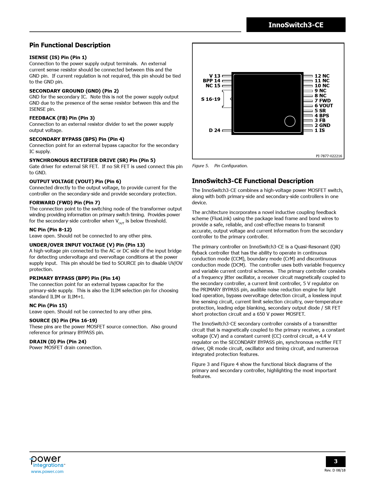 InnoSwitch3-CEPin Functional DescriptionISENSE (IS) Pin (Pin 1) Connection to the power supply output terminals. An external current sense resistor should be connected between this and the GND pin. If current regulation is not required, this pin should be tied V 1312 NC to the GND pin. BPP 1411 NCNC 1510 NCSECONDARY GROUND (GND) (Pin 2)9 NC GND for the secondary IC. Note this is not the power supply output 8 NCS 16-19 GND due to the presence of the sense resistor between this and the 7 FWD6 VOUT ISENSE pin. 5 SRFEEDBACK (FB) Pin (Pin 3)4 BPS3 FB Connection to an external resistor divider to set the power supply 2 GND output voltage. D 241 ISSECONDARY BYPASS (BPS) Pin (Pin 4) Connection point for an external bypass capacitor for the secondary IC supply. PI-7877-022216 SYNCHRONOUS RECTIFIER DRIVE (SR) Pin (Pin 5) Gate driver for external SR FET. If no SR FET is used connect this pin Figure 5. Pin Configuration. to GND. OUTPUT VOLTAGE (VOUT) Pin (Pin 6)InnoSwitch3-CE Functional Description Connected directly to the output voltage, to provide current for the The InnoSwitch3-CE combines a high-voltage power MOSFET switch, control er on the secondary-side and provide secondary protection. along with both primary-side and secondary-side control ers in one FORWARD (FWD) Pin (Pin 7) device. The connection point to the switching node of the transformer output winding providing information on primary switch timing. Provides power The architecture incorporates a novel inductive coupling feedback for the secondary-side control er when V is below threshold. scheme (FluxLink) using the package lead frame and bond wires to OUT provide a safe, reliable, and cost-effective means to transmit NC Pin (Pin 8-12) accurate, output voltage and current information from the secondary Leave open. Should not be connected to any other pins. control er to the primary control er. UNDER/OVER INPUT VOLTAGE (V) Pin (Pin 13) The primary control er on InnoSwitch3-CE is a Quasi-Resonant (QR) A high-voltage pin connected to the AC or DC side of the input bridge flyback control er that has the ability to operate in continuous for detecting undervoltage and overvoltage conditions at the power conduction mode (CCM), boundary mode (CrM) and discontinuous supply input. This pin should be tied to SOURCE pin to disable UV/OV conduction mode (DCM). The control er uses both variable frequency protection. and variable current control schemes. The primary control er consists PRIMARY BYPASS (BPP) Pin (Pin 14) of a frequency jitter oscillator, a receiver circuit magnetical y coupled to The connection point for an external bypass capacitor for the the secondary control er, a current limit control er, 5 V regulator on primary-side supply. This is also the ILIM selection pin for choosing the PRIMARY BYPASS pin, audible noise reduction engine for light standard ILIM or ILIM+1. load operation, bypass overvoltage detection circuit, a lossless input line sensing circuit, current limit selection circuitry, over-temperature NC Pin (Pin 15) protection, leading edge blanking, secondary output diode / SR FET Leave open. Should not be connected to any other pins. short protection circuit and a 650 V power MOSFET. SOURCE (S) Pin (Pin 16-19) These pins are the power MOSFET source connection. Also ground The InnoSwitch3-CE secondary control er consists of a transmitter reference for primary BYPASS pin. circuit that is magnetical y coupled to the primary receiver, a constant voltage (CV) and a constant current (CC) control circuit, a 4.4 V DRAIN (D) Pin (Pin 24) regulator on the SECONDARY BYPASS pin, synchronous rectifier FET Power MOSFET drain connection. driver, QR mode circuit, oscillator and timing circuit, and numerous integrated protection features. Figure 3 and Figure 4 show the functional block diagrams of the primary and secondary control er, highlighting the most important features. 3 Rev. D 08/18 www.power.com Document Outline Product Highlights Description Output Power Table Pin Functional Description InnoSwitch3-CE Functional Description Primary Controller Secondary Controller Applications Example Key Application Considerations Selection of Components Recommendations for Circuit Board Layout Layout Example Quick Design Checklist Absolute Maximum Ratings Thermal Resistance Key Electrical Characteristics Typical Performance Curves InSOP-24D Package Drawing InSOP-24D Package Marking Part Ordering Table MSL Table ESD and Latch-Up Table Part Ordering Information