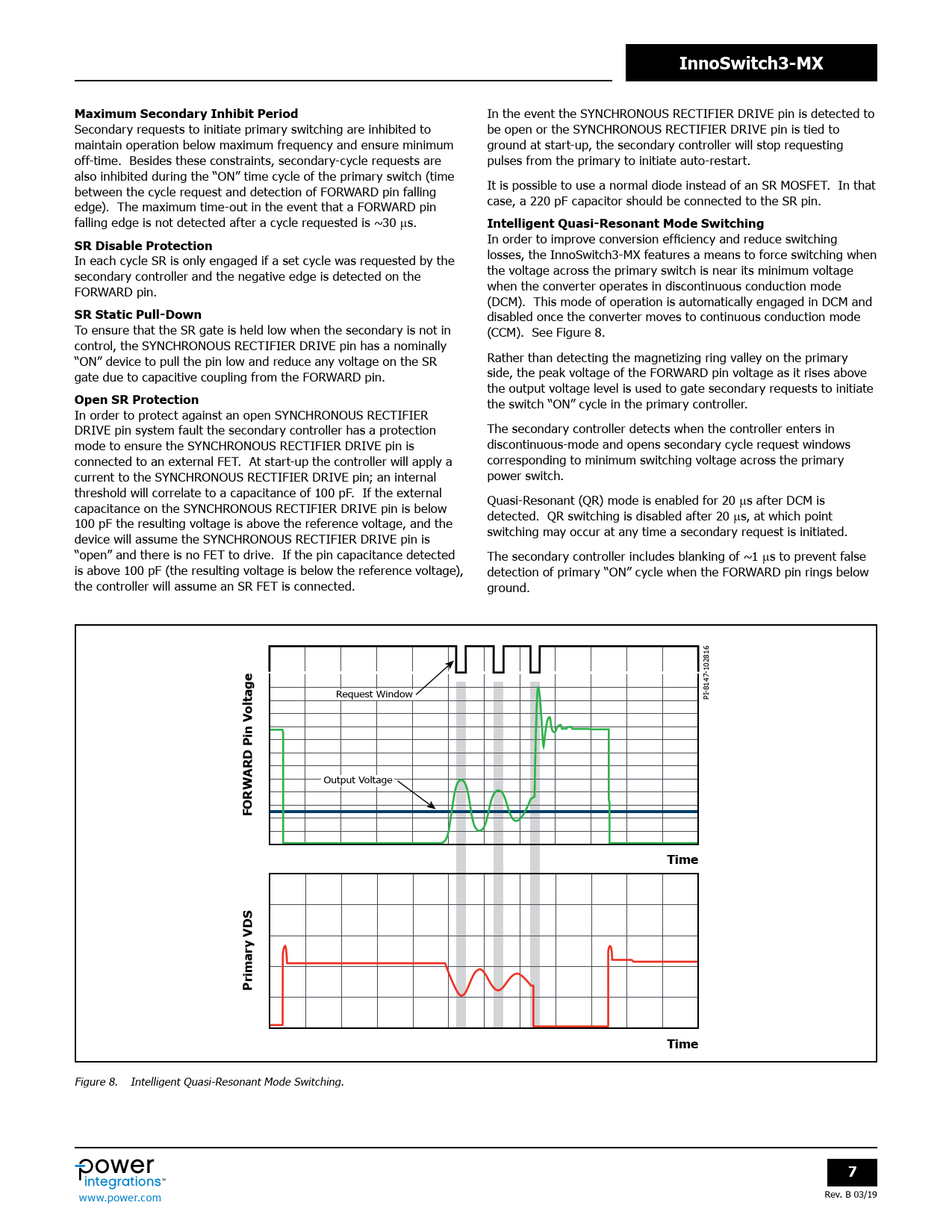 InnoSwitch3-MXMaximum Secondary Inhibit Period In the event the SYNCHRONOUS RECTIFIER DRIVE pin is detected to Secondary requests to initiate primary switching are inhibited to be open or the SYNCHRONOUS RECTIFIER DRIVE pin is tied to maintain operation below maximum frequency and ensure minimum ground at start-up, the secondary control er will stop requesting off-time. Besides these constraints, secondary-cycle requests are pulses from the primary to initiate auto-restart. also inhibited during the “ON” time cycle of the primary switch (time between the cycle request and detection of FORWARD pin falling It is possible to use a normal diode instead of an SR MOSFET. In that edge). The maximum time-out in the event that a FORWARD pin case, a 220 pF capacitor should be connected to the SR pin. falling edge is not detected after a cycle requested is ~30 µs. Intelligent Quasi-Resonant Mode SwitchingSR Disable Protection In order to improve conversion efficiency and reduce switching In each cycle SR is only engaged if a set cycle was requested by the losses, the InnoSwitch3-MX features a means to force switching when secondary control er and the negative edge is detected on the the voltage across the primary switch is near its minimum voltage FORWARD pin. when the converter operates in discontinuous conduction mode (DCM). This mode of operation is automatical y engaged in DCM and SR Static Pull-Down disabled once the converter moves to continuous conduction mode To ensure that the SR gate is held low when the secondary is not in (CCM). See Figure 8. control, the SYNCHRONOUS RECTIFIER DRIVE pin has a nominal y “ON” device to pull the pin low and reduce any voltage on the SR Rather than detecting the magnetizing ring val ey on the primary gate due to capacitive coupling from the FORWARD pin. side, the peak voltage of the FORWARD pin voltage as it rises above the output voltage level is used to gate secondary requests to initiate Open SR Protection the switch “ON” cycle in the primary control er. In order to protect against an open SYNCHRONOUS RECTIFIER DRIVE pin system fault the secondary control er has a protection The secondary control er detects when the control er enters in mode to ensure the SYNCHRONOUS RECTIFIER DRIVE pin is discontinuous-mode and opens secondary cycle request windows connected to an external FET. At start-up the control er will apply a corresponding to minimum switching voltage across the primary current to the SYNCHRONOUS RECTIFIER DRIVE pin; an internal power switch. threshold will correlate to a capacitance of 100 pF. If the external capacitance on the SYNCHRONOUS RECTIFIER DRIVE pin is below Quasi-Resonant (QR) mode is enabled for 20 µs after DCM is 100 pF the resulting voltage is above the reference voltage, and the detected. QR switching is disabled after 20 µs, at which point device will assume the SYNCHRONOUS RECTIFIER DRIVE pin is switching may occur at any time a secondary request is initiated. “open” and there is no FET to drive. If the pin capacitance detected The secondary control er includes blanking of ~1 µs to prevent false is above 100 pF (the resulting voltage is below the reference voltage), detection of primary “ON” cycle when the FORWARD pin rings below the control er will assume an SR FET is connected. ground. -8147-102816 Request Window PI Output Voltage FORWARD Pin VoltageTimePrimary VDSTime Figure 8. Intel igent Quasi-Resonant Mode Switching. 7 Rev. B 03/19 www.power.com Document Outline Product Highlights Description Output Power Table Pin Functional Description InnoSwitch3-MX Functional Description Absolute Maximum Ratings Thermal Resistance Key Electrical Characteristics InSOP-24D Package Drawing Part Ordering Information
