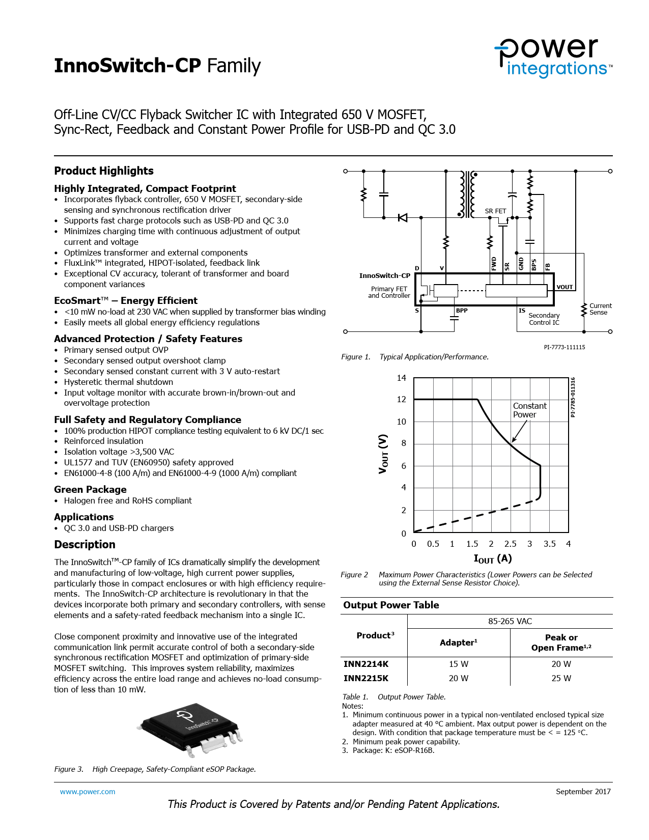 InnoSwitch-CP Family Off-Line CV/CC Flyback Switcher IC with Integrated 650 V MOSFET, Sync-Rect, Feedback and Constant Power Profile for USB-PD and QC 3.0 Product Highlights Highly Integrated, Compact Footprint • Incorporates flyback control er, 650 V MOSFET, secondary-side sensing and synchronous rectification driver SR FET • Supports fast charge protocols such as USB-PD and QC 3.0 • Minimizes charging time with continuous adjustment of output current and voltage • Optimizes transformer and external components • FluxLink™ integrated, HIPOT-isolated, feedback link DVFWDSRGNDBPSFB • Exceptional CV accuracy, tolerant of transformer and board InnoSwitch-CP component variances Primary FET VOUTEcoSmart ™ – Energy Efficient and Controller Current • <10 mW no-load at 230 VAC when supplied by transformer bias winding SBPPIS Secondary Sense • Easily meets all global energy efficiency regulations Control IC Advanced Protection / Safety Features • Primary sensed output OVP PI-7773-111115 • Secondary sensed output overshoot clamp Figure 1. Typical Application/Performance. • Secondary sensed constant current with 3 V auto-restart 14 • Hysteretic thermal shutdown • Input voltage monitor with accurate brown-in/brown-out and overvoltage protection 12 Constant Full Safety and Regulatory Compliance Power PI-7785-011316 10 • 100% production HIPOT compliance testing equivalent to 6 kV DC/1 sec • Reinforced insulation 8 • Isolation voltage >3,500 VAC (V) • UL1577 and TUV (EN60950) safety approved 6 • EN61000-4-8 (100 A/m) and EN61000-4-9 (1000 A/m) compliant V OUTGreen Package 4 • Halogen free and RoHS compliant 2 Applications • QC 3.0 and USB-PD chargers 0 Description 0 0.5 1 1.5 2 2.5 3 3.5 4 The InnoSwitch™-CP family of ICs dramatical y simplify the development IOUT (A) and manufacturing of low-voltage, high current power supplies, Figure 2 Maximum Power Characteristics (Lower Powers can be Selected particularly those in compact enclosures or with high efficiency require- using the External Sense Resistor Choice). ments. The InnoSwitch-CP architecture is revolutionary in that the devices incorporate both primary and secondary control ers, with sense Output Power Table elements and a safety-rated feedback mechanism into a single IC. 85-265 VAC Close component proximity and innovative use of the integrated Product3Peak or communication link permit accurate control of both a secondary-side Adapter1Open Frame1,2 synchronous rectification MOSFET and optimization of primary-side MOSFET switching. This improves system reliability, maximizes INN2214K 15 W 20 W efficiency across the entire load range and achieves no-load consump- INN2215K 20 W 25 W tion of less than 10 mW. Table 1. Output Power Table. Notes: 1. Minimum continuous power in a typical non-ventilated enclosed typical size adapter measured at 40 °C ambient. Max output power is dependent on the design. With condition that package temperature must be < = 125 °C. 2. Minimum peak power capability. 3. Package: K: eSOP-R16B. Figure 3. High Creepage, Safety-Compliant eSOP Package. www.power.com September 2017 This Product is Covered by Patents and/or Pending Patent Applications. Document Outline Product Highlights Highly Integrated, Compact Footprint EcoSmart - Energy Efficient Advanced Protection / Safety Features Full Safety and Regulatory Compliance Green Package Applications Description Output Power Table Pin Functional Description InnoSwitch-CP Functional Description InnoSwitch-CP Operation Applications Example Key application Considerations Selection of Components Recommendations for Circuit Board Layout Recommendations for EMI Reduction Recommendations for Audible Noise Suppression Recommendations for Transformer Design Quick Design Checklist Absolute Maximum Ratings Thermal Resistance Key Electrical Characteristics NOTES Typical Performance Characteristics eSOP-R16B Package Package Marking MSL Table ESD and Latch-Up Table Part Ordering Information