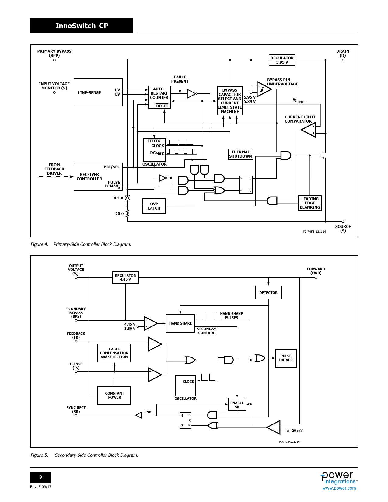 InnoSwitch-CP PRIMARY BYPASS DRAIN (BPP) (D) REGULATOR 5.95 V FAULT PRESENT BYPASS PIN INPUT VOLTAGE + UNDERVOLTAGE MONITOR (V) AUTO- UV BYPASS LINE-SENSE RESTART - OV CAPACITOR COUNTER 5.95 V SELECT AND 5.39 V VILIMIT CURRENT RESET LIMIT STATE MACHINE CURRENT LIMIT COMPARATOR - + JITTER CLOCK DCMAX THERMAL SHUTDOWN FROM OSCILLATOR PRI/SEC FEEDBACK DRIVER RECEIVER