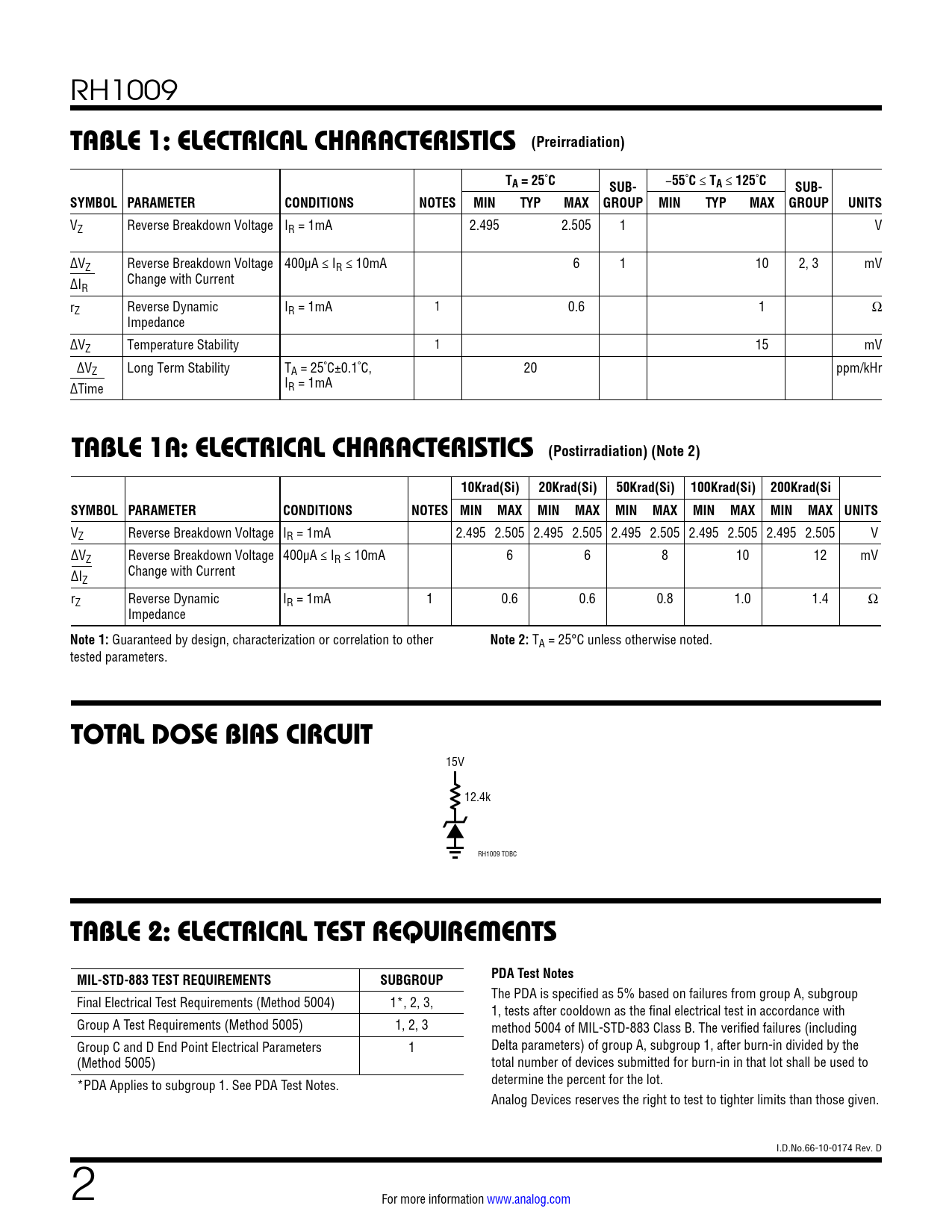 RH1009 TABLE 1: ELECTRICAL CHARACTERISTICS (Preirradiation)TA = 25 ˚ CSUB- − 55 ˚ C ≤ TA ≤ 125 ˚ CSUB-SYMBOL PARAMETERCONDITIONSNOTES MINTYPMAX GROUP MINTYPMAX GROUPUNITS VZ Reverse Breakdown Voltage IR = 1mA 2.495 2.505 1 V �VZ Reverse Breakdown Voltage 400µA ≤ IR ≤ 10mA 6 1 10 2, 3 mV �I Change with Current R rZ Reverse Dynamic IR = 1mA 1 0.6 1 Ω Impedance �VZ Temperature Stability 1 15 mV �VZ Long Term Stability TA = 25˚C±0.1˚C, 20 ppm/kHr �Time IR = 1mA TABLE 1A: ELECTRICAL CHARACTERISTICS (Postirradiation) (Note 2)10Krad(Si)20Krad(Si)50Krad(Si) 100Krad(Si) 200Krad(SiSYMBOL PARAMETERCONDITIONSNOTES MIN MAX MIN MAX MIN MAX MIN MAX MIN MAX UNITS VZ Reverse Breakdown Voltage IR = 1mA 2.495 2.505 2.495 2.505 2.495 2.505 2.495 2.505 2.495 2.505 V �VZ Reverse Breakdown Voltage 400µA ≤ IR ≤ 10mA 6 6 8 10 12 mV �I Change with Current Z rZ Reverse Dynamic IR = 1mA 1 0.6 0.6 0.8 1.0 1.4 Ω Impedance Note 1: Guaranteed by design, characterization or correlation to other Note 2: TA = 25°C unless otherwise noted. tested parameters. TOTAL DOSE BIAS CIRCUIT 15V 12.4k RH1009 TDBC TABLE 2: ELECTRICAL TEST REQUIREMENTSMIL-STD-883 TEST REQUIREMENTSSUBGROUPPDA Test Notes The PDA is specified as 5% based on failures from group A, subgroup Final Electrical Test Requirements (Method 5004) 1*, 2, 3, 1, tests after cooldown as the final electrical test in accordance with Group A Test Requirements (Method 5005) 1, 2, 3 method 5004 of MIL-STD-883 Class B. The verified failures (including Group C and D End Point Electrical Parameters 1 Delta parameters) of group A, subgroup 1, after burn-in divided by the (Method 5005) total number of devices submitted for burn-in in that lot shall be used to *PDA Applies to subgroup 1. See PDA Test Notes. determine the percent for the lot. Analog Devices reserves the right to test to tighter limits than those given. I.D.No.66-10-0174 Rev. D 2 For more information www.analog.com Document Outline Description Burn-In Circuit Absolute Maximum Ratings Package/Order Information Table 1: Electrical Characteristics Table 1A: Electrical Characteristics Total Dose Bias Circuit Table 2: Electrical Test Requirements Revision History Typical Performance Characteristics