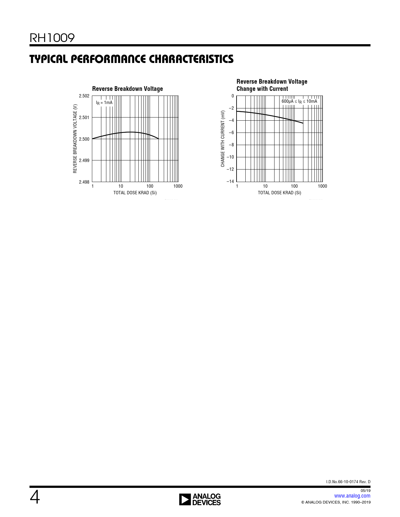 2.502 0 600μA ≤ I I R ≤ 10mA R = 1mA –2 2.501 –4 –6 2.500 –8 –10 2.499 REVERSE BREAKDOWN VOLTAGE CHANGE WITH CURRENT (mV) –12 REVERSE BREAKDOWN VOLTAGE (V) 2.498 –14 1 10 100 1000 1 10 100 1000 TOTAL DOSE KRAD (Si) TOTAL DOSE KRAD (Si) RH1009 G01 RH1009 G02 I.D.No.66-10-0174 Rev. D 4 05/19 www.analog.com For more information www.analog.com ANALOG DEVICES, INC. 1990–2019 Document Outline Description Burn-In Circuit Absolute Maximum Ratings Package/Order Information Table 1: Electrical Characteristics Table 1A: Electrical Characteristics Total Dose Bias Circuit Table 2: Electrical Test Requirements Revision History Typical Performance Characteristics