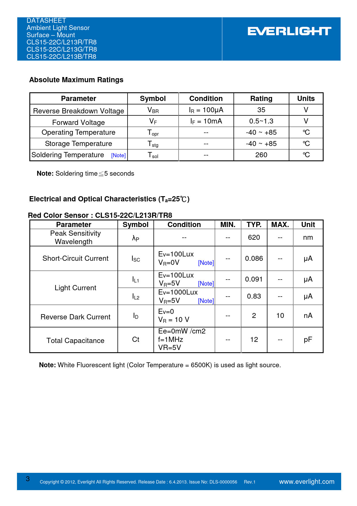 White Fluorescent light (Color Temperature = 6500K) is used as light source. 3 Copyright © 2012, Everlight All Rights Reserved. Release Date : 6.4.2013. Issue No: DLS-0000056 Rev.1 www.everlight.com