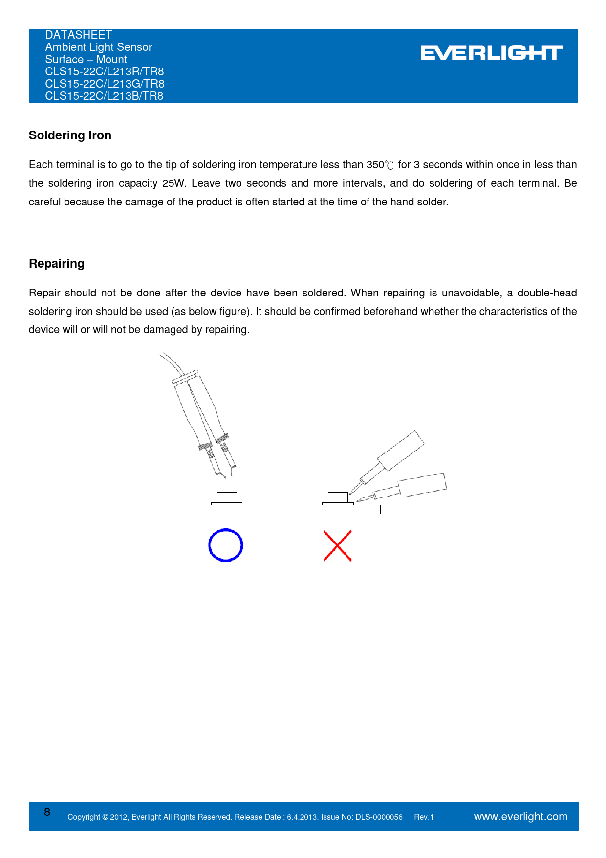 Repair should not be done after the device have been soldered. When repairing is unavoidable, a double-head soldering iron should be used (as below figure). It should be confirmed beforehand whether the characteristics of the device will or will not be damaged by repairing. 8 Copyright © 2012, Everlight All Rights Reserved. Release Date : 6.4.2013. Issue No: DLS-0000056 Rev.1 www.everlight.com