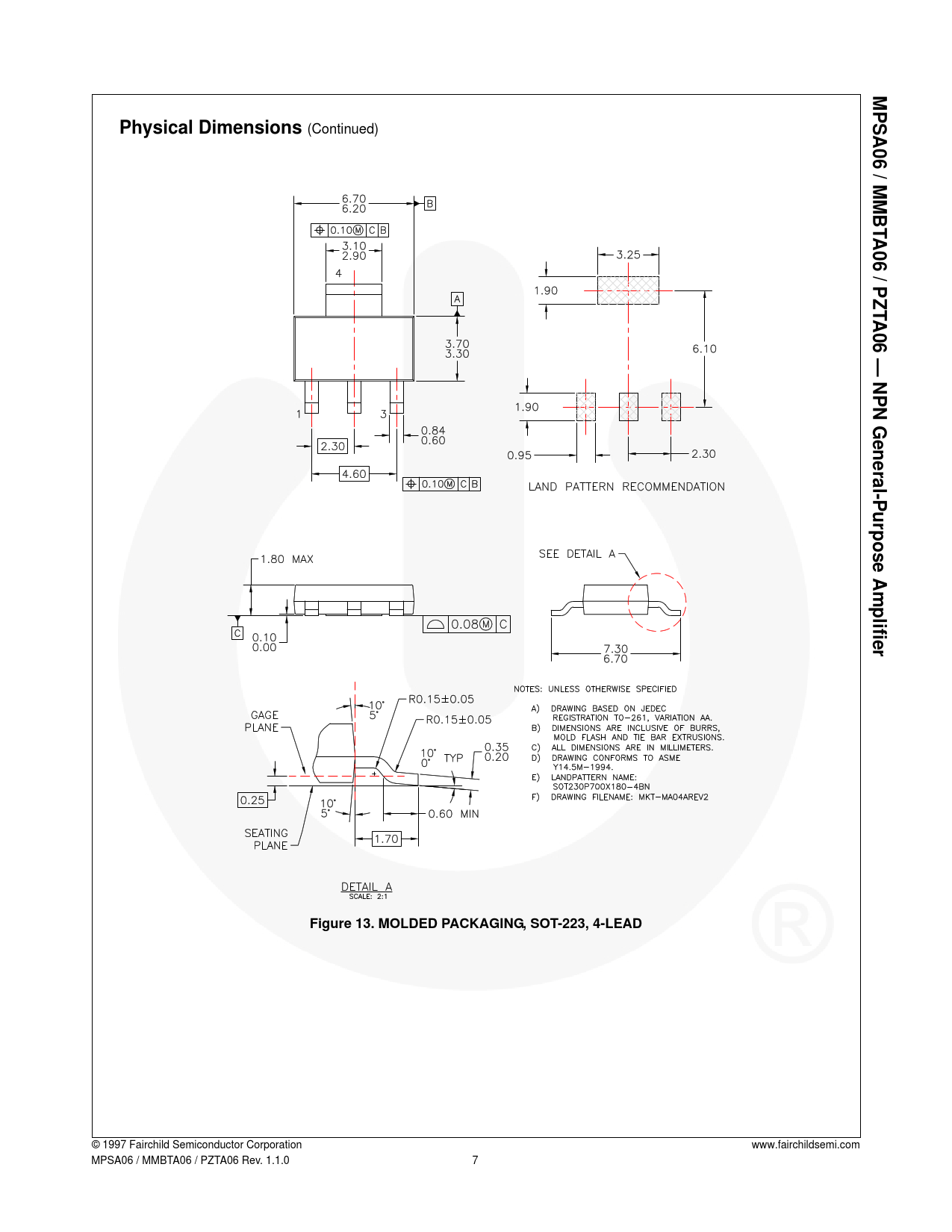 MPSA06 / MMBTA06 / PZTA06 — NPN General-Purpose Amplifier Physical Dimensions (Continued) Figure 13. MOLDED PACKAGING, SOT-223, 4-LEAD © 1997 Fairchild Semiconductor Corporation