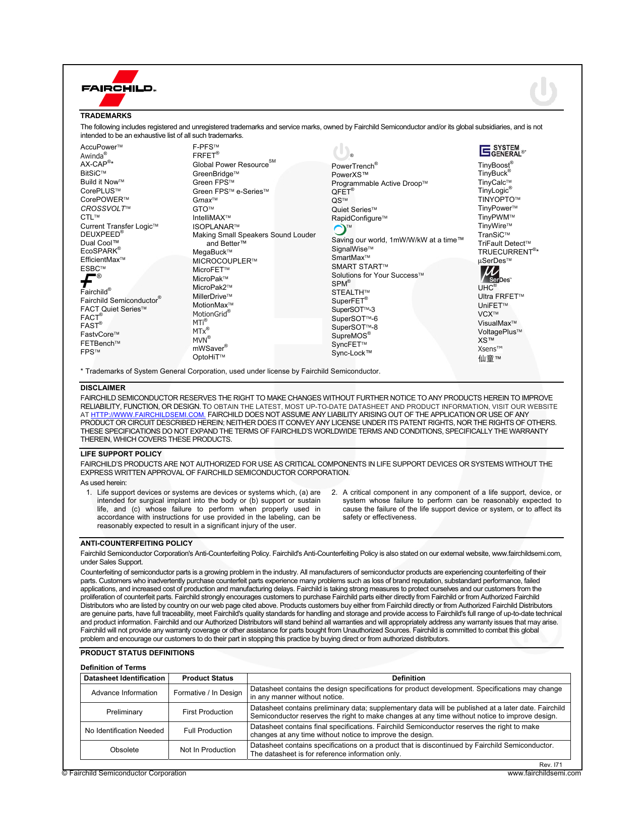 Datasheet Identification Product Status Advance Information Formative / In Design Preliminary First Production No Identification Needed Full Production Obsolete Not In Production © Fairchild Semiconductor Corporation Definition