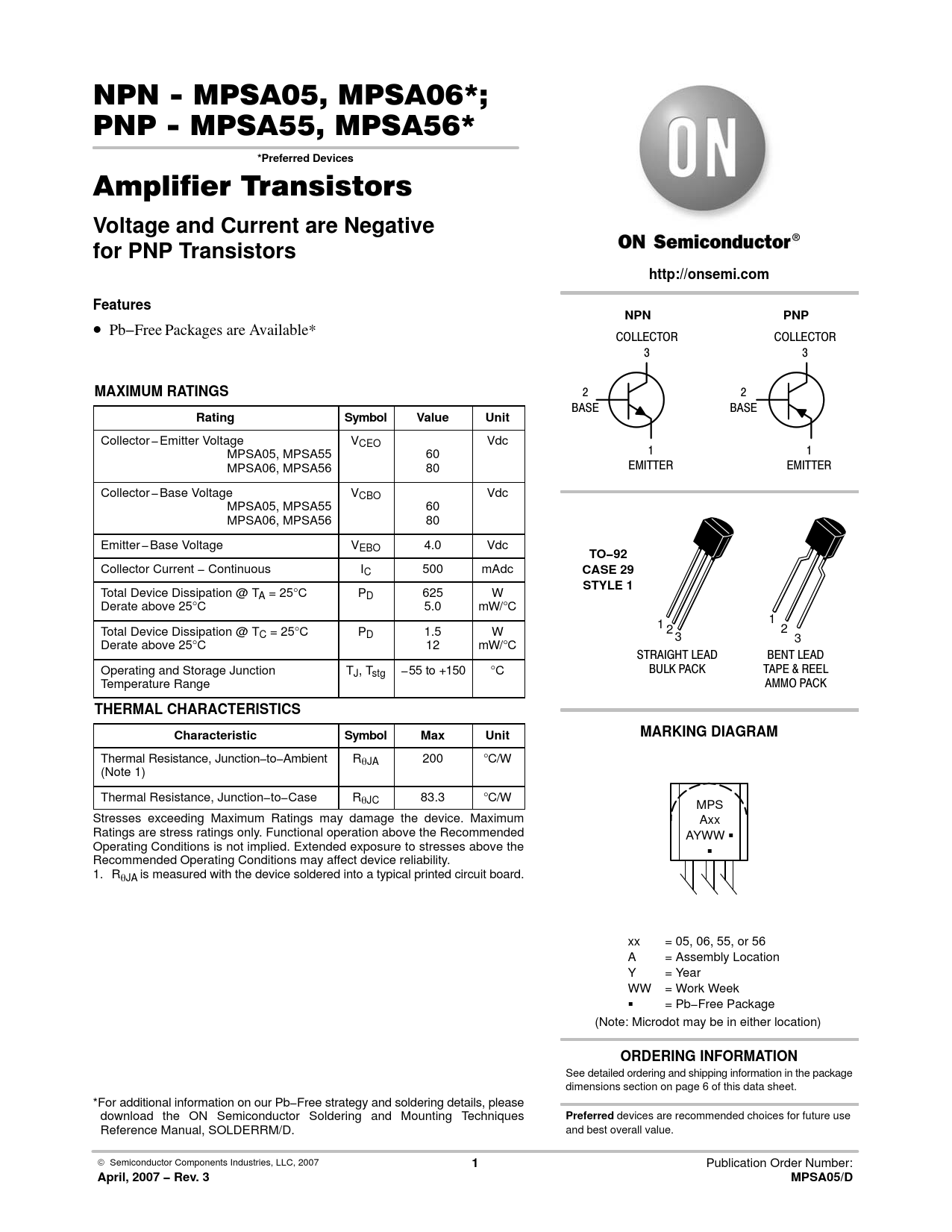 Datasheet MPSA05, MPSA06, MPSA55, MPSA56 (ON Semiconductor)