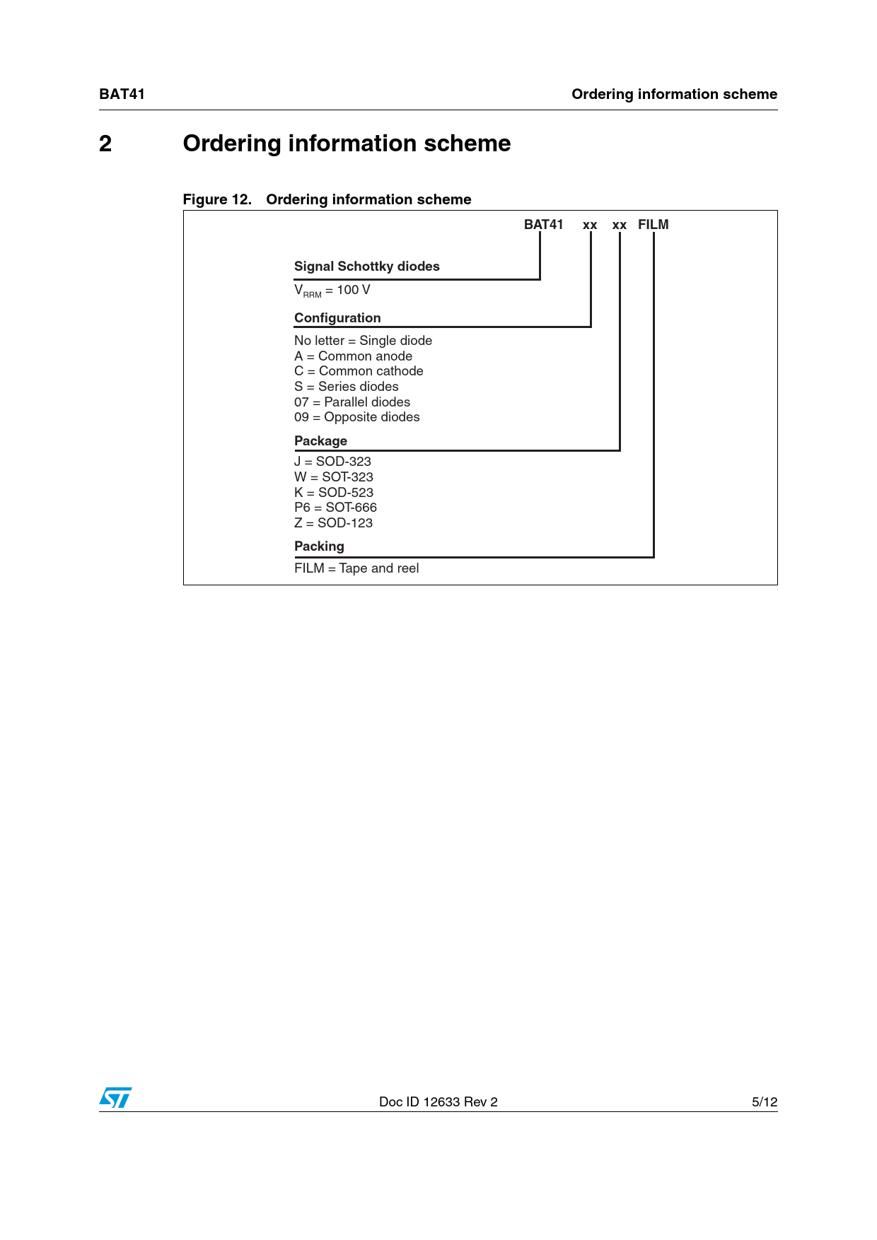 BAT41Ordering information scheme2Ordering information schemeFigure 12.Ordering information schemeBAT41 xx xx FILMSignal Schottky diodes V = 100 V RRM Configuration No letter = Single diode A = Common anode C = Common cathode S = Series diodes 07 = Parallel diodes 09 = Opposite diodes Package J = SOD-323 W = SOT-323 K = SOD-523 P6 = SOT-666 Z = SOD-123 Packing FILM = Tape and reel Doc ID 12633 Rev 2 5/12 Document Outline Table 1. Device summary 1 Characteristics Table 2. Absolute ratings (limiting values at Tj = 25 ˚C, unless otherwise specified) Table 3. Thermal parameters Table 4. Static electrical characteristics Table 5. Dynamic characteristics Figure 1. Average forward power dissipation versus average forward current Figure 2. Average forward current versus ambient temperature (d = 1) Figure 3. Reverse leakage current versus reverse applied voltage (typical values) Figure 4. Reverse leakage current versus junction temperature (typical values) Figure 5. Junction capacitance versus reverse applied voltage (typical values) Figure 6. Forward voltage drop versus forward current (typical values) Figure 7. Forward voltage drop versus forward current (typical values) Figure 8. Variation of thermal impedance junction to ambient versus pulse duration Figure 9. Relative variation of thermal impedance junction to ambient versus pulse duration Figure 10. Relative variation of thermal impedance junction to ambient versus pulse duration Figure 11. Thermal resistance junction to ambient versus copper surface under each lead 2 Ordering information scheme Figure 12. Ordering information scheme 3 Package information Table 6. SOD-123 dimensions Figure 13. SOD-123 footprint (dimensions in mm) Table 7. SOD-323 dimensions Figure 14. SOD-323 footprint (dimensions in mm) Table 8. SOD-523 dimensions Figure 15. SOD-523 footprint (dimensions in mm) Table 9. SOT-323 dimensions Figure 16. SOT-323 footprint (dimensions in mm) Table 10. SOT-666 dimensions Figure 17. SOT-666 footprint (dimensions in mm) 4 Ordering information Table 11. Ordering information 5 Revision history Table 12. Document revision history