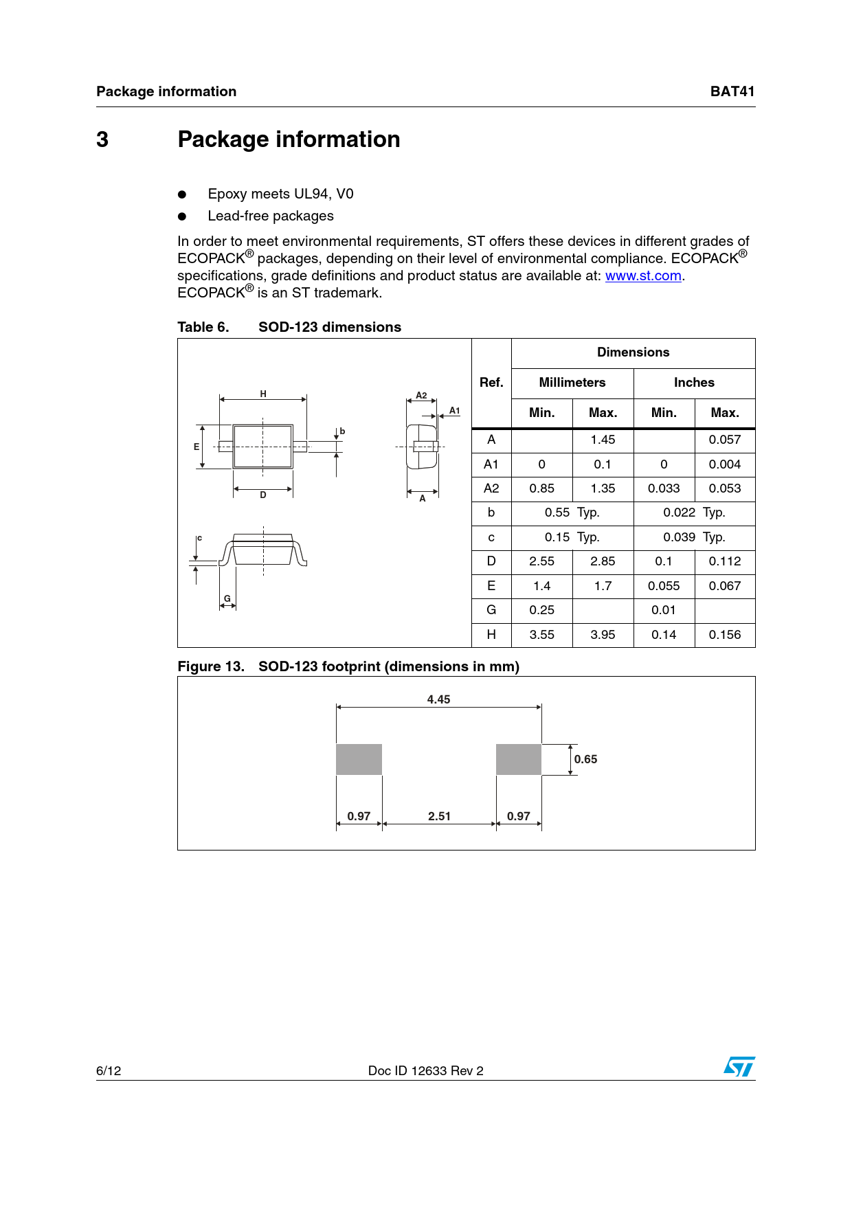 Package information BAT41 3 Package information Table 6 SOD-123 dimensions Dimensions Ref Millimeters Inches Min Max Figure 13