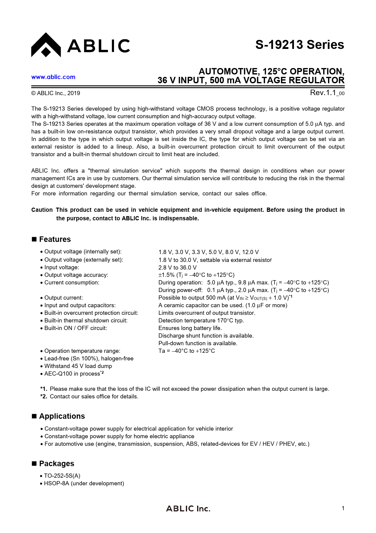 © ABLIC Inc., 2019 Rev.1.1_00 The S-19213 Series developed by using high-withstand voltage CMOS process technology, is a positive voltage regulator with a high-withstand voltage, low current consumption and high-accuracy output voltage. The S-19213 Series operates at the maximum operation voltage of 36 V and a low current consumption of 5.0 μA typ. and has a built-in low on-resistance output transistor, which provides a very small dropout voltage and a large output current. In addition to the type in which output voltage is set inside the IC, the type for which output voltage can be set via an external resistor is added to a lineup. Also, a built-in overcurrent protection circuit to limit overcurrent of the output transistor and a built-in thermal shutdown circuit to limit heat are included. ABLIC Inc. offers a "thermal simulation service" which supports the thermal design in conditions when our power management ICs are in use by customers. Our thermal simulation service will contribute to reducing the risk in the thermal design at customers' development stage. For more information regarding our thermal simulation service, contact our sales office.