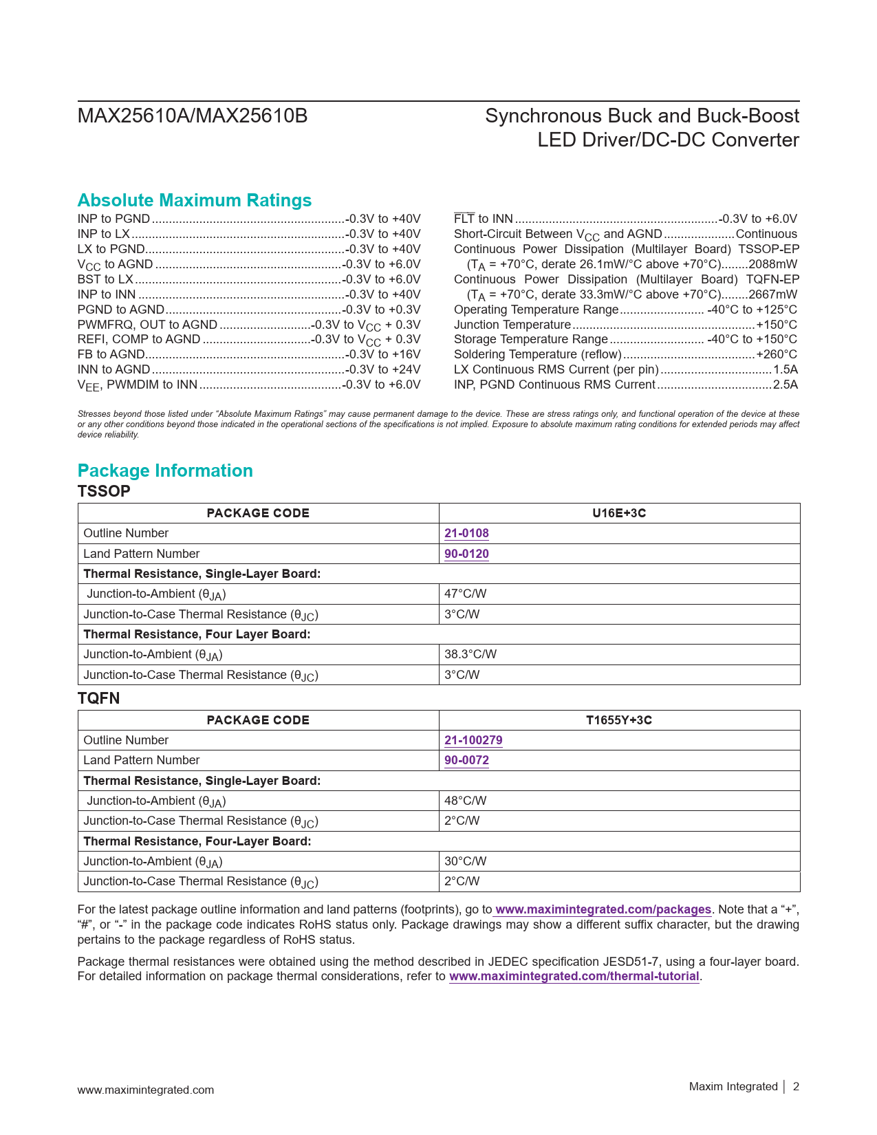 MAX25610A/MAX25610B Synchronous Buck and Buck-Boost LED Driver/DC-DC Converter Absolute Maximum Ratings INP to PGND ...-0.3V to +40V FLT to INN ..-0.3V to +6.0V INP to LX ...-0.3V to +40V Short-Circuit Between VCC and AGND ...Continuous LX to PGND...-0.3V to +40V Continuous Power Dissipation (Multilayer Board) TSSOP-EP VCC to AGND ...-0.3V to +6.0V (TA = +70°C, derate 26.1mW/°C above +70°C) ..2088mW BST to LX ...-0.3V to +6.0V Continuous Power Dissipation (Multilayer Board) TQFN-EP INP to INN ...-0.3V to +40V (TA = +70°C, derate 33.3mW/°C above +70°C) ..2667mW PGND to AGND ..-0.3V to +0.3V Operating Temperature Range ... -40°C to +125°C PWMFRQ, OUT to AGND ...-0.3V to VCC + 0.3V Junction Temperature ..+150°C REFI, COMP to AGND ..-0.3V to VCC + 0.3V Storage Temperature Range .. -40°C to +150°C FB to AGND...-0.3V to +16V Soldering Temperature (reflow) ...+260°C INN to AGND ...-0.3V to +24V LX Continuous RMS Current (per pin) ...1.5A VEE, PWMDIM to INN ..-0.3V to +6.0V INP, PGND Continuous RMS Current ..2.5A Stresses beyond those listed under “Absolute Maximum Ratings” may cause permanent damage to the device. These are stress ratings only, and functional operation of the device at these or any other conditions beyond those indicated in the operational sections of the specifications is not implied. Exposure to absolute maximum rating conditions for extended periods may affect device reliability. Package InformationTSSOPPACKAGE CODEU16E+3C Outline Number 21-0108 Land Pattern Number 90-0120Thermal Resistance, Single-Layer Board: Junction-to-Ambient (θJA) 47°C/W Junction-to-Case Thermal Resistance (θJC) 3°C/W Thermal Resistance, Four Layer Board: Junction-to-Ambient (θJA) 38.3°C/W Junction-to-Case Thermal Resistance (θJC) 3°C/W TQFNPACKAGE CODET1655Y+3C Outline Number 21-100279 Land Pattern Number 90-0072Thermal Resistance, Single-Layer Board: Junction-to-Ambient (θJA) 48°C/W Junction-to-Case Thermal Resistance (θJC) 2°C/W Thermal Resistance, Four-Layer Board: Junction-to-Ambient (θJA) 30°C/W Junction-to-Case Thermal Resistance (θJC) 2°C/W For the latest package outline information and land patterns (footprints), go to www.maximintegrated.com/packages . Note that a “+”, “#”, or “-” in the package code indicates RoHS status only. Package drawings may show a different suffix character, but the drawing pertains to the package regardless of RoHS status. Package thermal resistances were obtained using the method described in JEDEC specification JESD51-7, using a four-layer board. For detailed information on package thermal considerations, refer to www.maximintegrated.com/thermal-tutorial . www.maximintegrated.com Maxim Integrated │ 2