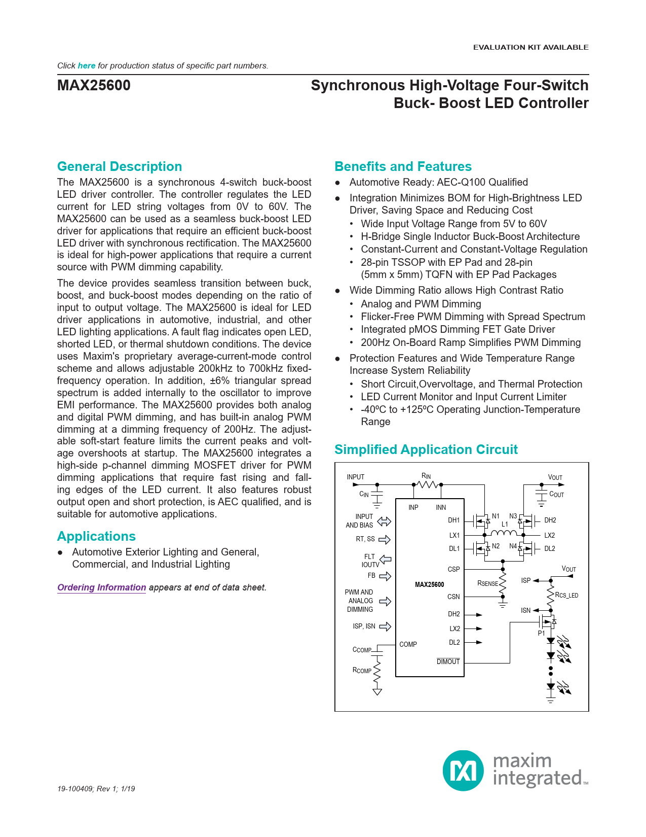 EVALUATION KIT AVAILABLE. here. MAX25600. Synchronous High-Voltage Four-Switch. Buck- Boost LED Controller. General Description