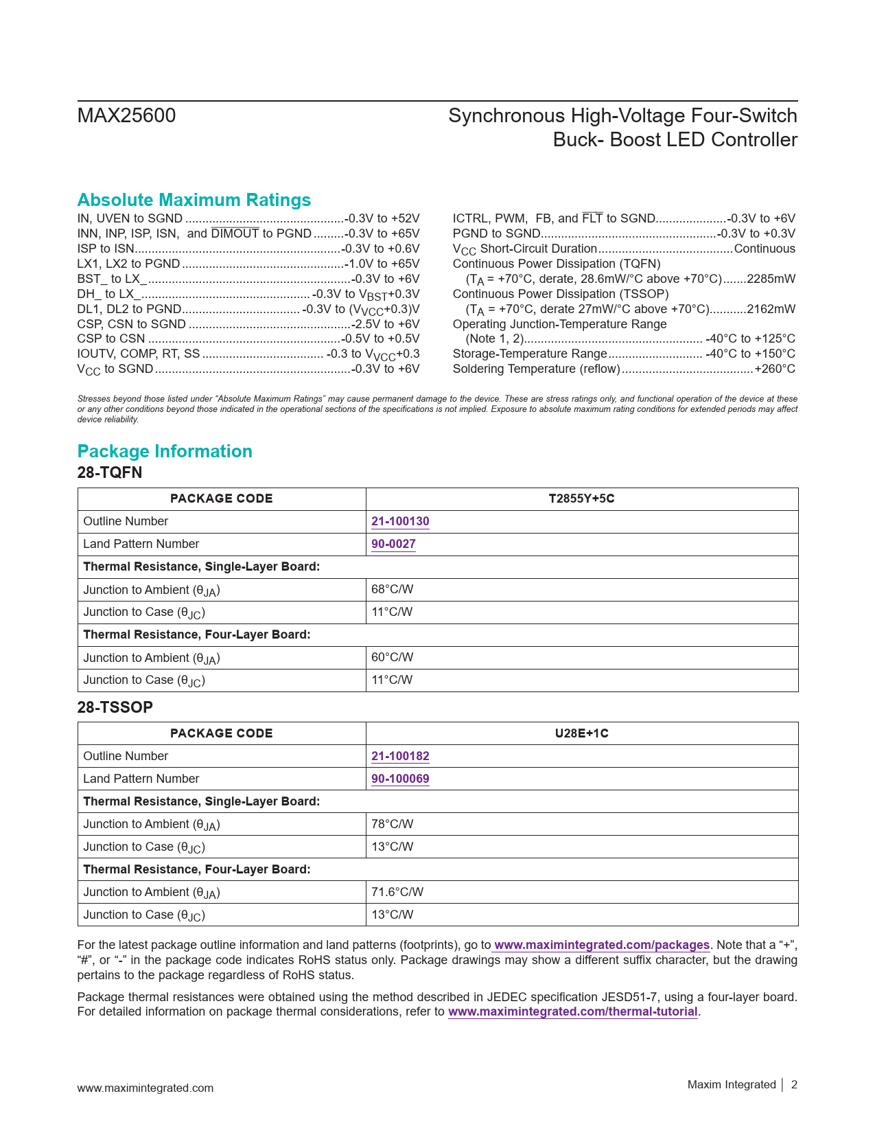 Pages / Page24 / 2 — Absolute Maximum Ratings. Package Information. 28-TQFN. PACKAGE CODE. …
