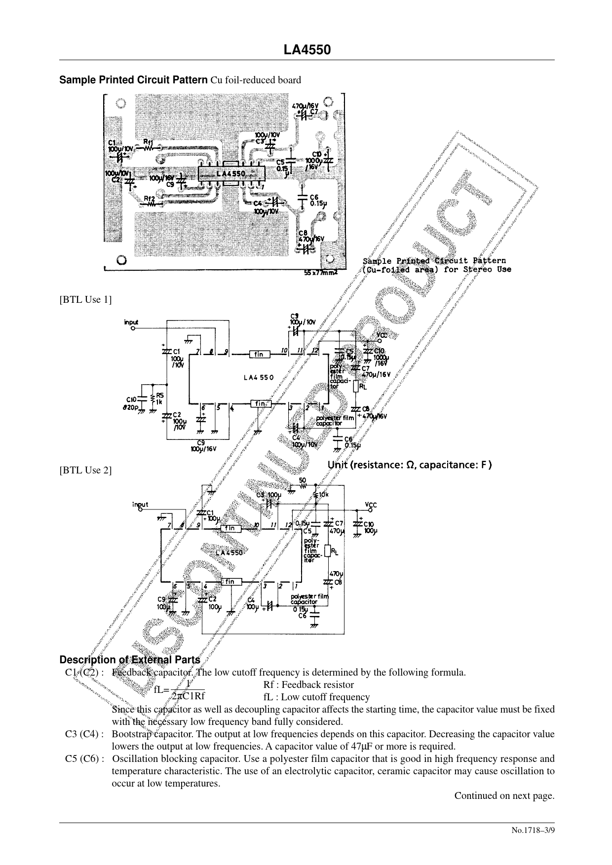 LA4550Sample Printed Circuit Pattern Cu foil-reduced board [BTL Use 1] [BTL Use 2] Description of External Parts C1 (C2) : Feedback capacitor. The low cutoff frequency is determined by the following formula. 1 Rf : Feedback resistor fL= 2πC1Rf fL : Low cutoff frequency Since this capacitor as well as decoupling capacitor affects the starting time, the capacitor value must be fixed with the necessary low frequency band fully considered. C3 (C4) : Bootstrap capacitor. The output at low frequencies depends on this capacitor. Decreasing the capacitor value lowers the output at low frequencies. A capacitor value of 47µF or more is required. C5 (C6) : Oscillation blocking capacitor. Use a polyester film capacitor that is good in high frequency response and temperature characteristic. The use of an electrolytic capacitor, ceramic capacitor may cause oscillation to occur at low temperatures. Continued on next page. No.1718–3/9