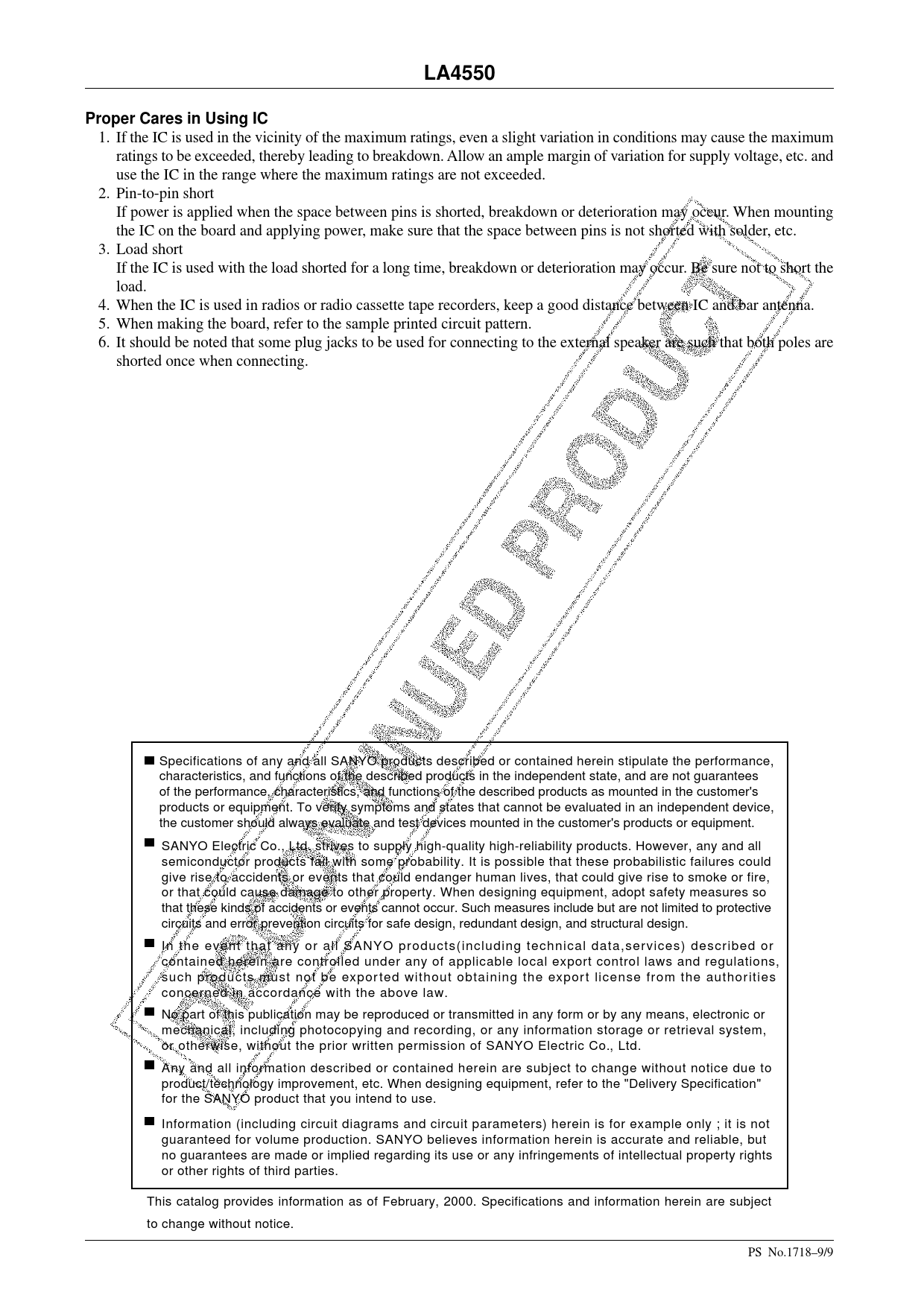 1. If the IC is used in the vicinity of the maximum ratings, even a slight variation in conditions may cause the maximum ratings to be exceeded, thereby leading to breakdown. Allow an ample margin of variation for supply voltage, etc. and use the IC in the range where the maximum ratings are not exceeded. 2. Pin-to-pin short If power is applied when the space between pins is shorted, breakdown or deterioration may occur. When mounting the IC on the board and applying power, make sure that the space between pins is not shorted with solder, etc. 3. Load short If the IC is used with the load shorted for a long time, breakdown or deterioration may occur. Be sure not to short the load. 4. When the IC is used in radios or radio cassette tape recorders, keep a good distance between IC and bar antenna. 5. When making the board, refer to the sample printed circuit pattern. 6. It should be noted that some plug jacks to be used for connecting to the external speaker are such that both poles are shorted once when connecting. Specifications of any and all SANYO products described or contained herein stipulate the performance, characteristics, and functions of the described products in the independent state, and are not guarantees of the performance, characteristics, and functions of the described products as mounted in the customer's products or equipment. To verify symptoms and states that cannot be evaluated in an independent device, the customer should always evaluate and test devices mounted in the customer's products or equipment. SANYO Electric Co., Ltd. strives to supply high-quality high-reliability products. However, any and all semiconductor products fail with some probability. It is possible that these probabilistic failures could give rise to accidents or events that could endanger human lives, that could give rise to smoke or fire, or that could cause damage to other property. When designing equipment, adopt safety measures so that these kinds of accidents or events cannot occur. Such measures include but are not limited to protective circuits and error prevention circuits for safe design, redundant design, and structural design. In the event that any or all SANYO products(including technical data,services) described or contained herein are controlled under any of applicable local export control laws and regulations, such products must not be expor ted without obtaining the expor t license from the author ities concerned in accordance with the above law. No part of this publication may be reproduced or transmitted in any form or by any means, electronic or mechanical, including photocopying and recording, or any information storage or retrieval system, or otherwise, without the prior written permission of SANYO Electric Co. , Ltd. Any and all information described or contained herein are subject to change without notice due to product/technology improvement, etc. When designing equipment, refer to the "Delivery Specification" for the SANYO product that you intend to use. Information (including circuit diagrams and circuit parameters) herein is for example only ; it is not guaranteed for volume production. SANYO believes information herein is accurate and reliable, but no guarantees are made or implied regarding its use or any infringements of intellectual property rights or other rights of third parties. This catalog provides information as of February, 2000. Specifications and information herein are subject to change without notice. PS No.1718–9/9