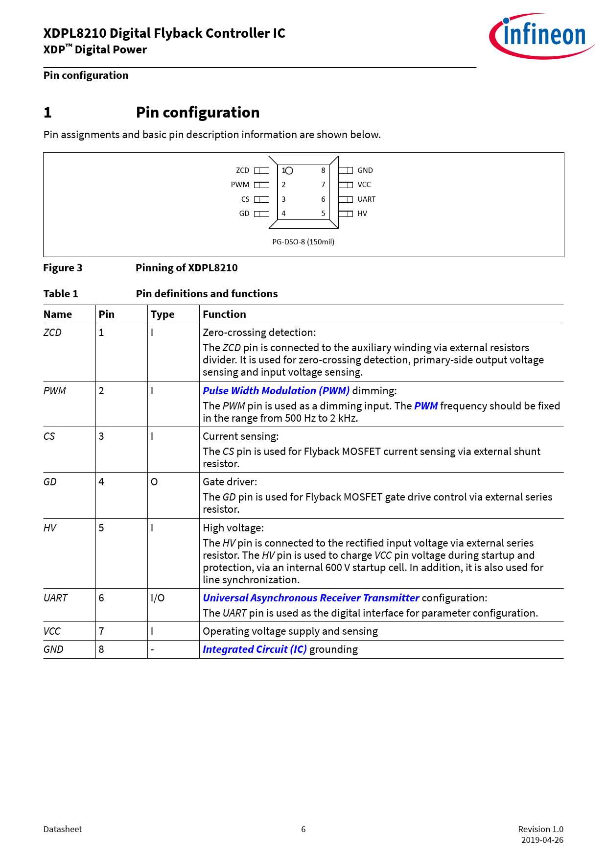 Pin assignments and basic pin description information are shown below. ZCD 1 8 GND PWM 2 7 VCC CS 3 6 UART GD 4 5 HV PG-DSO-8 (150mil)