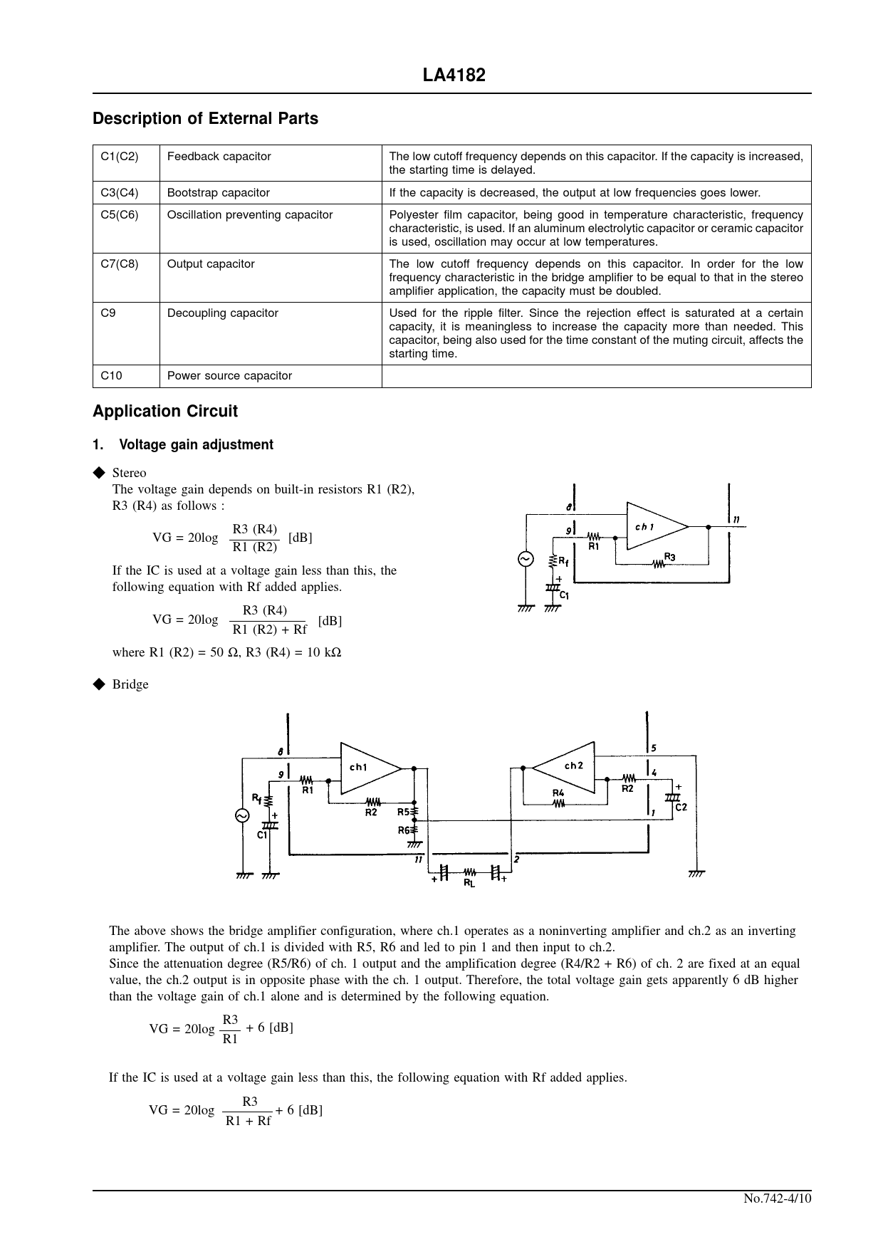 LA4182Description of External Parts C1(C2) Feedback capacitor The low cutoff frequency depends on this capacitor. If the capacity is increased, the starting time is delayed. C3(C4) Bootstrap capacitor If the capacity is decreased, the output at low frequencies goes lower. C5(C6) Oscillation preventing capacitor Polyester film capacitor, being good in temperature characteristic, frequency characteristic, is used. If an aluminum electrolytic capacitor or ceramic capacitor is used, oscillation may occur at low temperatures. C7(C8) Output capacitor The low cutoff frequency depends on this capacitor. In order for the low frequency characteristic in the bridge amplifier to be equal to that in the stereo amplifier application, the capacity must be doubled. C9 Decoupling capacitor Used for the ripple filter. Since the rejection effect is saturated at a certain capacity, it is meaningless to increase the capacity more than needed. This capacitor, being also used for the time constant of the muting circuit, affects the starting time. C10 Power source capacitor Application Circuit1.Voltage gain adjustment k Stereo The voltage gain depends on built-in resistors R1 (R2), R3 (R4) as follows : R3 (R4) VG = 20log [dB] R1 (R2) If the IC is used at a voltage gain less than this, the following equation with Rf added applies. R3 (R4) VG = 20log [dB] R1 (R2) + Rf where R1 (R2) = 50 Ω, R3 (R4) = 10 kΩ k Bridge The above shows the bridge amplifier configuration, where ch.1 operates as a noninverting amplifier and ch.2 as an inverting amplifier. The output of ch.1 is divided with R5, R6 and led to pin 1 and then input to ch.2. Since the attenuation degree (R5/R6) of ch. 1 output and the amplification degree (R4/R2 + R6) of ch. 2 are fixed at an equal value, the ch.2 output is in opposite phase with the ch. 1 output. Therefore, the total voltage gain gets apparently 6 dB higher than the voltage gain of ch.1 alone and is determined by the following equation. R3 VG = 20log + 6 [dB] R1 If the IC is used at a voltage gain less than this, the following equation with Rf added applies. R3 VG = 20log + 6 [dB] R1 + Rf No.742-4/10