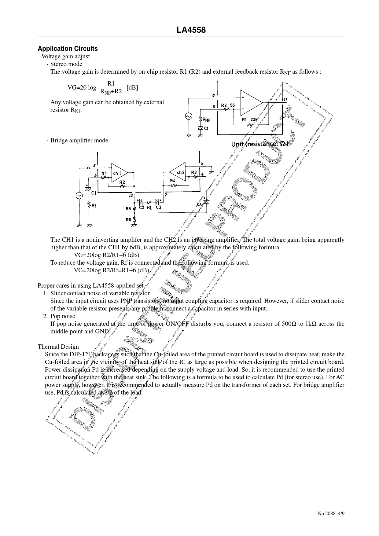 Voltage gain adjust · Stereo mode The voltage gain is determined by on-chip resistor R1 (R2) and external feedback resistor RNF as follows : R1 VG=20 log [dB] RNF+R2 Any voltage gain can be obtained by external resistor RNf. · Bridge amplifier mode The CH1 is a noninverting amplifer and the CH2 is an inverting amplifier. The total voltage gain, being apparently higher than that of the CH1 by 6dB, is approximately calculated by the following formura. VG=20log R2/R1+6 (dB) To reduce the voltage gain, Rf is connected and the following formura is used. VG=20log R2/Rf=R1+6 (dB) Proper cares in using LA4558-applied set 1. Slider contact noise of variable resistor Since the input circuit uses PNP transistors, no input coupling capacitor is required. However, if slider contact noise of the variable resistor presents any problem, connect a capacitor in series with input. 2. Pop noise If pop noise generated at the time of power ON/OFF disturbs you, connect a resistor of 500Ω to 1kΩ across the middle point and GND. Thermal Design Since the DIP-12F package is such that the Cu-foiled area of the printed circuit board is used to dissipate heat, make the Cu-foiled area in the vicinity of the heat sink of the IC as large as possible when designing the printed circuit board. Power dissipation Pd is increased depending on the supply voltage and load. So, it is recommended to use the printed circuit board together with the heat sink. The following is a formula to be used to calculate Pd (for stereo use). For AC power supply, however, it is recommended to actually measure Pd on the transformer of each set. For bridge amplifier use, Pd is calculated at 1/2 of the load. No.2088–4/9