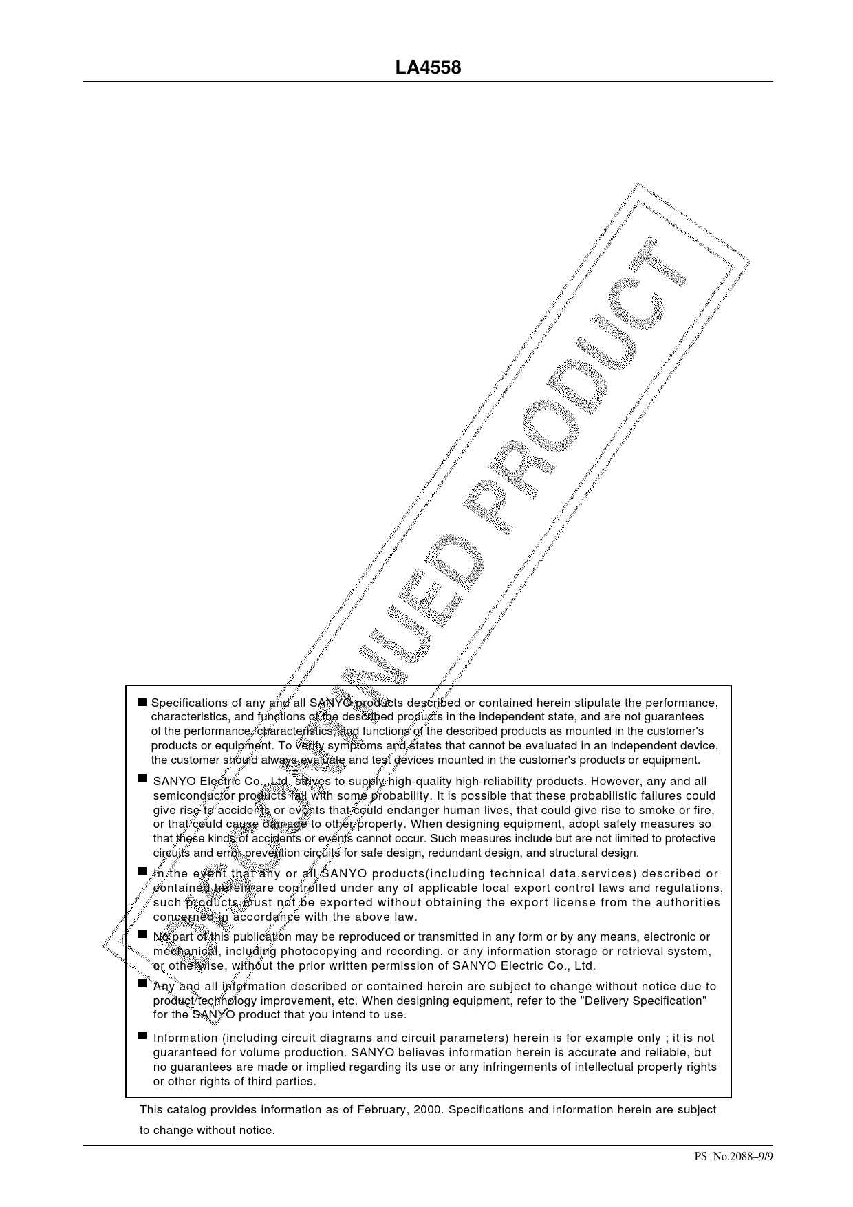 LA4558 Specifications of any and all SANYO products described or contained herein stipulate the performance, characteristics, and functions of the described products in the independent state, and are not guarantees of the performance, characteristics, and functions of the described products as mounted in the customer's products or equipment. To verify symptoms and states that cannot be evaluated in an independent device, the customer should always evaluate and test devices mounted in the customer's products or equipment. SANYO Electric Co., Ltd. strives to supply high-quality high-reliability products. However, any and all semiconductor products fail with some probability. It is possible that these probabilistic failures could give rise to accidents or events that could endanger human lives, that could give rise to smoke or fire, or that could cause damage to other property. When designing equipment, adopt safety measures so that these kinds of accidents or events cannot occur. Such measures include but are not limited to protective circuits and error prevention circuits for safe design, redundant design, and structural design. In the event that any or all SANYO products(including technical data,services) described or contained herein are controlled under any of applicable local export control laws and regulations, such products must not be expor ted without obtaining the expor t license from the author ities concerned in accordance with the above law. No part of this publication may be reproduced or transmitted in any form or by any means, electronic or mechanical, including photocopying and recording, or any information storage or retrieval system, or otherwise, without the prior written permission of SANYO Electric Co. , Ltd. Any and all information described or contained herein are subject to change without notice due to product/technology improvement, etc. When designing equipment, refer to the "Delivery Specification" for the SANYO product that you intend to use. Information (including circuit diagrams and circuit parameters) herein is for example only ; it is not guaranteed for volume production. SANYO believes information herein is accurate and reliable, but no guarantees are made or implied regarding its use or any infringements of intellectual property rights or other rights of third parties. This catalog provides information as of February, 2000. Specifications and information herein are subject to change without notice. PS No.2088–9/9