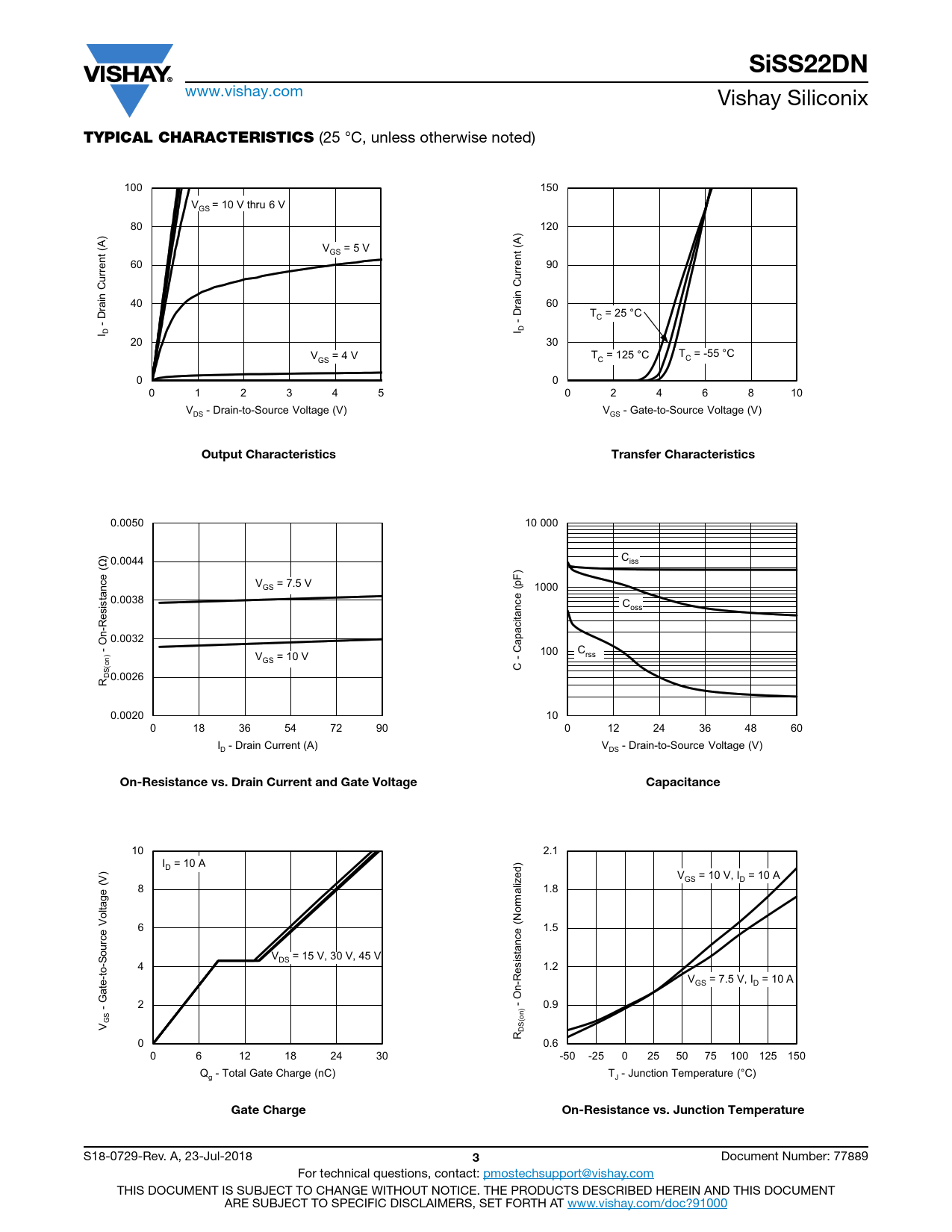 SiSS22DN www.vishay.com Vishay Siliconix TYPICAL CHARACTERISTICS (25 °C, unless otherwise noted) 100 150 V = 10 V thru 6 V GS 80 120 ) V = 5 V GS 60 90 rrent (A ne rrent (A ne u u C n n C 2nd li 40 2nd li rai 60 D Drai T = 25 °C - - C I D I D 20 30 V = 4 V T = 125 °C T = -55 °C GS C C 0 0 0 1 2 3 4 5 0 2 4 6 8 10 V - Drain-to-Source Voltage (V) V - Gate-to-Source Voltage (V) DS GS 2nd line 2nd line Output CharacteristicsTransfer Characteristics Axis Title Axis Title 0.0050 10000 10 000 10000 0.0044 C Ω) iss V = 7.5 V GS 1000 1000 1000 0.0038 stance ( C ne ne ne ne oss ne ne -Resi n 1st li 2nd li 1st li 0.0032 2nd li 2nd li 2nd li apacitance (pF) -O 100 C 100 C 100 ) rss n V = 10 V - GS C DS(o 0.0026 R 0.0020 10 10 10 0 18 36 54 72 90 0 12 24 36 48 60 I - Drain Current (A) V - Drain-to-Source Voltage (V) D DS 2nd line 2nd line On-Resistance vs. Drain Current and Gate VoltageCapacitance Axis Title Axis Title 10 10000 2.1 10000 I = 10 A ) D ed) V = 10 V, I = 10 A (V GS D 8 liz a 1.8 ltage orm o 1000 1000 6 1.5 ne ne ne ne ne ne ource V tance (N V = 15 V, 30 V, 45 V s DS 1st li 1st li 2nd li 4 2nd li 2nd li 1.2 2nd li 100 V = 7.5 V, I = 10 A 100 GS D ate-to-S n-Resi G O - 2 - 0.9 GS (on) V S DR 0 10 0.6 10 0 6 12 18 24 30 -50 -25 0 25 50 75 100 125 150 Q - Total Gate Charge (nC) T - Junction Temperature (°C) g J 2nd line 2nd line Gate ChargeOn-Resistance vs. Junction Temperature S18-0729-Rev. A, 23-Jul-2018 3 Document Number: 77889 For technical questions, contact: pmostechsupport@vishay.com THIS DOCUMENT IS SUBJECT TO CHANGE WITHOUT NOTICE. THE PRODUCTS DESCRIBED HEREIN AND THIS DOCUMENT ARE SUBJECT TO SPECIFIC DISCLAIMERS, SET FORTH AT www.vishay.com/doc?91000