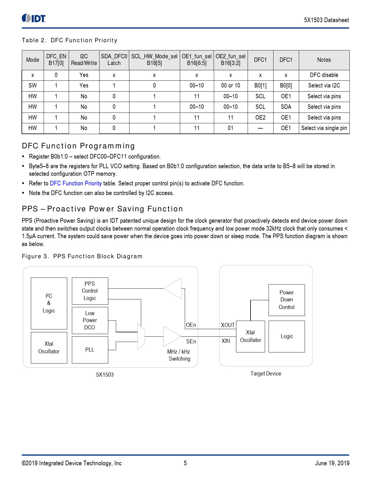 PPS Control Power I2C Logic Down & Control Logic Low Power DCO OEn XOUT Xtal Logic XIN Oscil ator Xtal SEn Oscil ator PLL MHz / kHz Switching 5X1503 Target Device ©2019 Integrated Device Technology, Inc 5 June 19, 2019 Document Outline Description Typical Applications Features Output Features Key Specifications Block Diagram Pin Assignments Figure 1. Pin Assignments for 2.0 × 2.0 mm 10-VFQFPN Package Pin Descriptions Table 1. Pin Descriptions Device Feature and Function DFC – Dynamic Frequency Control Figure 2. DFC Function Block Diagram Table 2. DFC Function Priority DFC Function Programming PPS – Proactive Power Saving Function Figure 3. PPS Function Block Diagram Figure 4. PPS Assertion/Deassertion Timing Chart PPS Function Programming Output Divider Selection Table 3. Output Divider Selection Device Output Support 5X1503 5X1503L 5X1503S Input Pin Function Table 4. OE Pin Function Table 5. OE Pin Function Summary Table 6. PD# Priority Spread Spectrum Spread Spectrum Digital Spread Spectrum Figure 5. Digital Spread Spectrum Absolute Maximum Ratings Table 7. Absolute Maximum Ratings Thermal Characteristics Table 8. Thermal Characteristics Recommended Operating Conditions Table 9. Recommended Operating Conditions Crystal Characteristics Table 10. Embedded Crystal Characteristics DC Electrical Characteristics Table 11. DC Electrical Characteristics – Current Table 12. DC Electrical Characteristics – Input and Output Voltage AC Electrical Characteristics Table 13. AC Timing Electrical Characteristics I2C Bus DC Characteristics Table 14. I2C Bus DC Characteristics Table 15. I2C Bus AC Characteristics Spread Spectrum Generation Specifications Table 16. Spread Spectrum Generation Specifications (5X1503S only) General I2C Interface Information How to Write How to Read Glossary of Features Table 17. Glossary of Features Package Outline Drawings Ordering Information Marking Diagrams Revision History