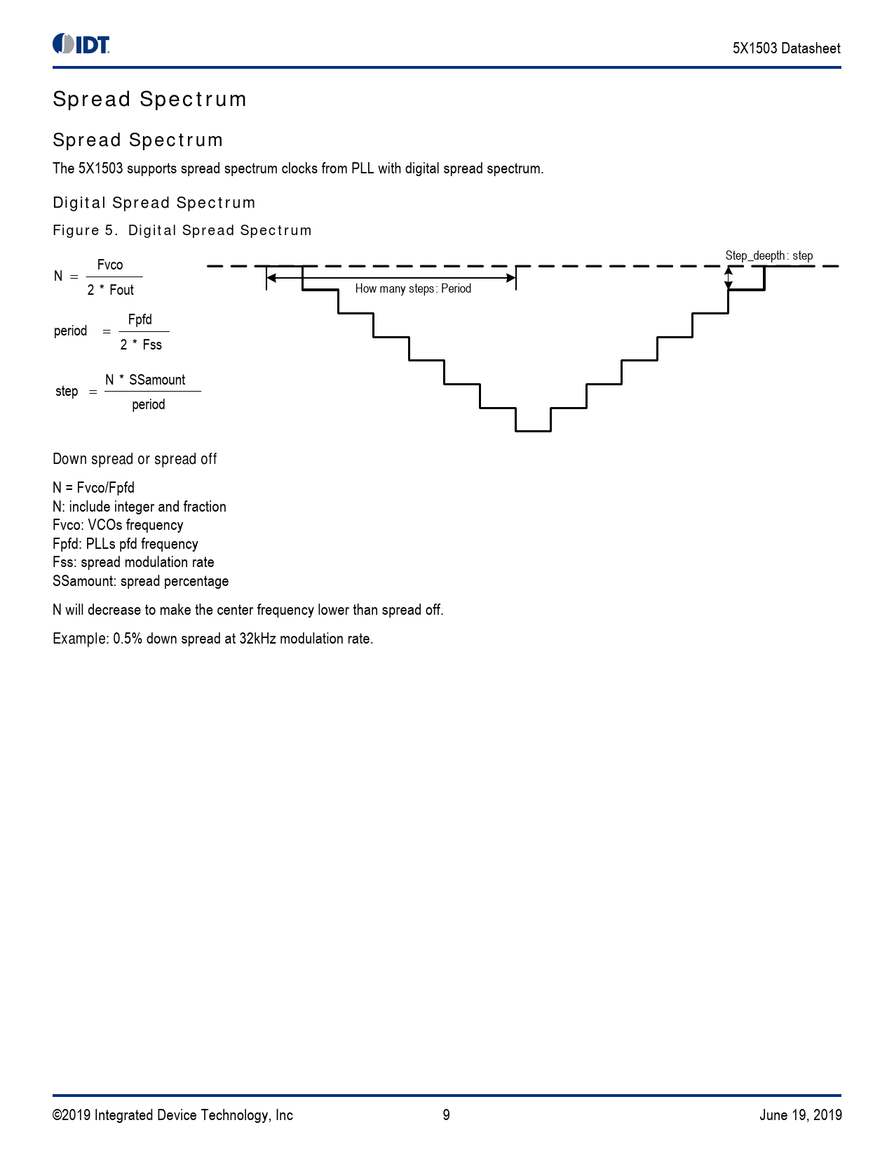 The 5X1503 supports spread spectrum clocks from PLL with digital spread spectrum.