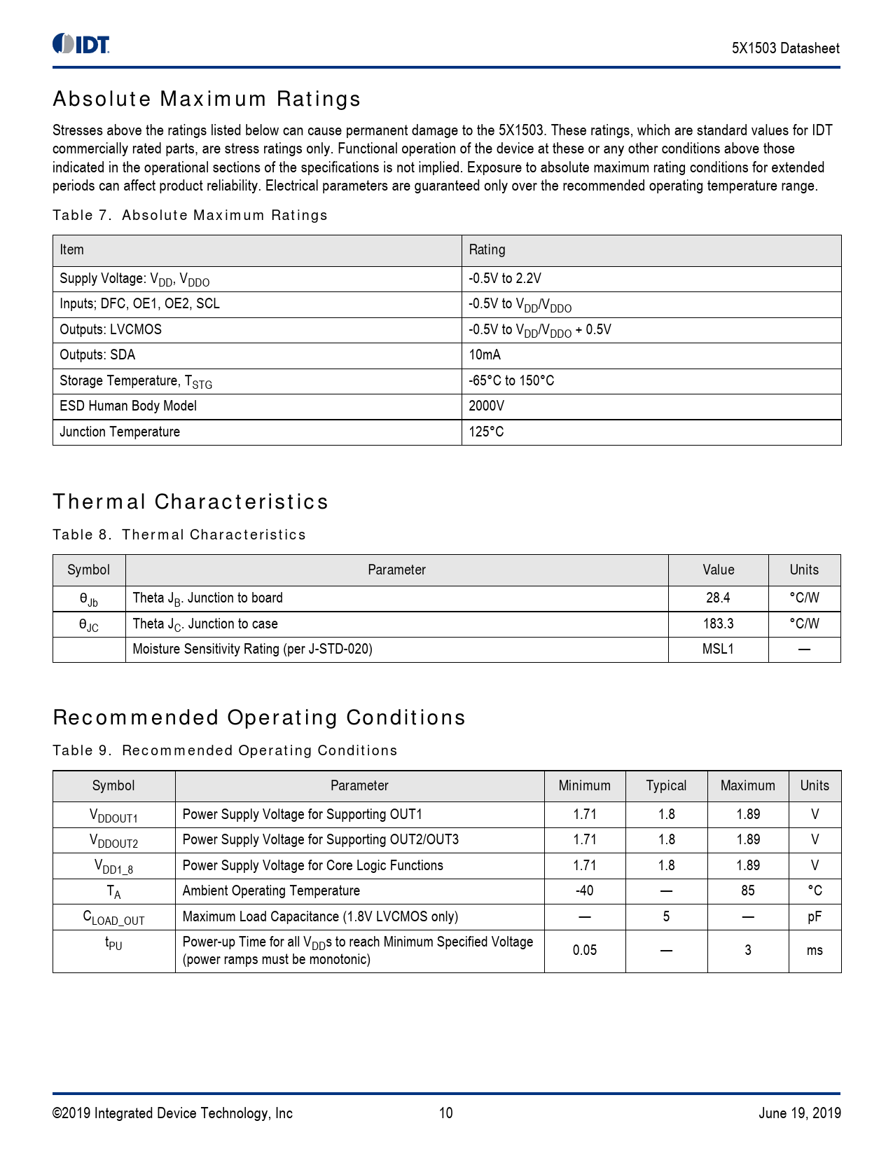 VDDOUT1 Power Supply Voltage for Supporting OUT1 1.71 1.8 1.89 V VDDOUT2 Power Supply Voltage for Supporting OUT2/OUT3 1.71 1.8 1.89 V VDD1_8 Power Supply Voltage for Core Logic Functions 1.71 1.8 1.89 V TA Ambient Operating Temperature -40 — 85 °C CLOAD_OUT Maximum Load Capacitance (1.8V LVCMOS only) — 5 — pF tPU Power-up Time for all VDDs to reach Minimum Specified Voltage 0.05 — 3 ms (power ramps must be monotonic) ©2019 Integrated Device Technology, Inc 10 June 19, 2019 Document Outline Description Typical Applications Features Output Features Key Specifications Block Diagram Pin Assignments Figure 1. Pin Assignments for 2.0 × 2.0 mm 10-VFQFPN Package Pin Descriptions Table 1. Pin Descriptions Device Feature and Function DFC – Dynamic Frequency Control Figure 2. DFC Function Block Diagram Table 2. DFC Function Priority DFC Function Programming PPS – Proactive Power Saving Function Figure 3. PPS Function Block Diagram Figure 4. PPS Assertion/Deassertion Timing Chart PPS Function Programming Output Divider Selection Table 3. Output Divider Selection Device Output Support 5X1503 5X1503L 5X1503S Input Pin Function Table 4. OE Pin Function Table 5. OE Pin Function Summary Table 6. PD# Priority Spread Spectrum Spread Spectrum Digital Spread Spectrum Figure 5. Digital Spread Spectrum Absolute Maximum Ratings Table 7. Absolute Maximum Ratings Thermal Characteristics Table 8. Thermal Characteristics Recommended Operating Conditions Table 9. Recommended Operating Conditions Crystal Characteristics Table 10. Embedded Crystal Characteristics DC Electrical Characteristics Table 11. DC Electrical Characteristics – Current Table 12. DC Electrical Characteristics – Input and Output Voltage AC Electrical Characteristics Table 13. AC Timing Electrical Characteristics I2C Bus DC Characteristics Table 14. I2C Bus DC Characteristics Table 15. I2C Bus AC Characteristics Spread Spectrum Generation Specifications Table 16. Spread Spectrum Generation Specifications (5X1503S only) General I2C Interface Information How to Write How to Read Glossary of Features Table 17. Glossary of Features Package Outline Drawings Ordering Information Marking Diagrams Revision History
