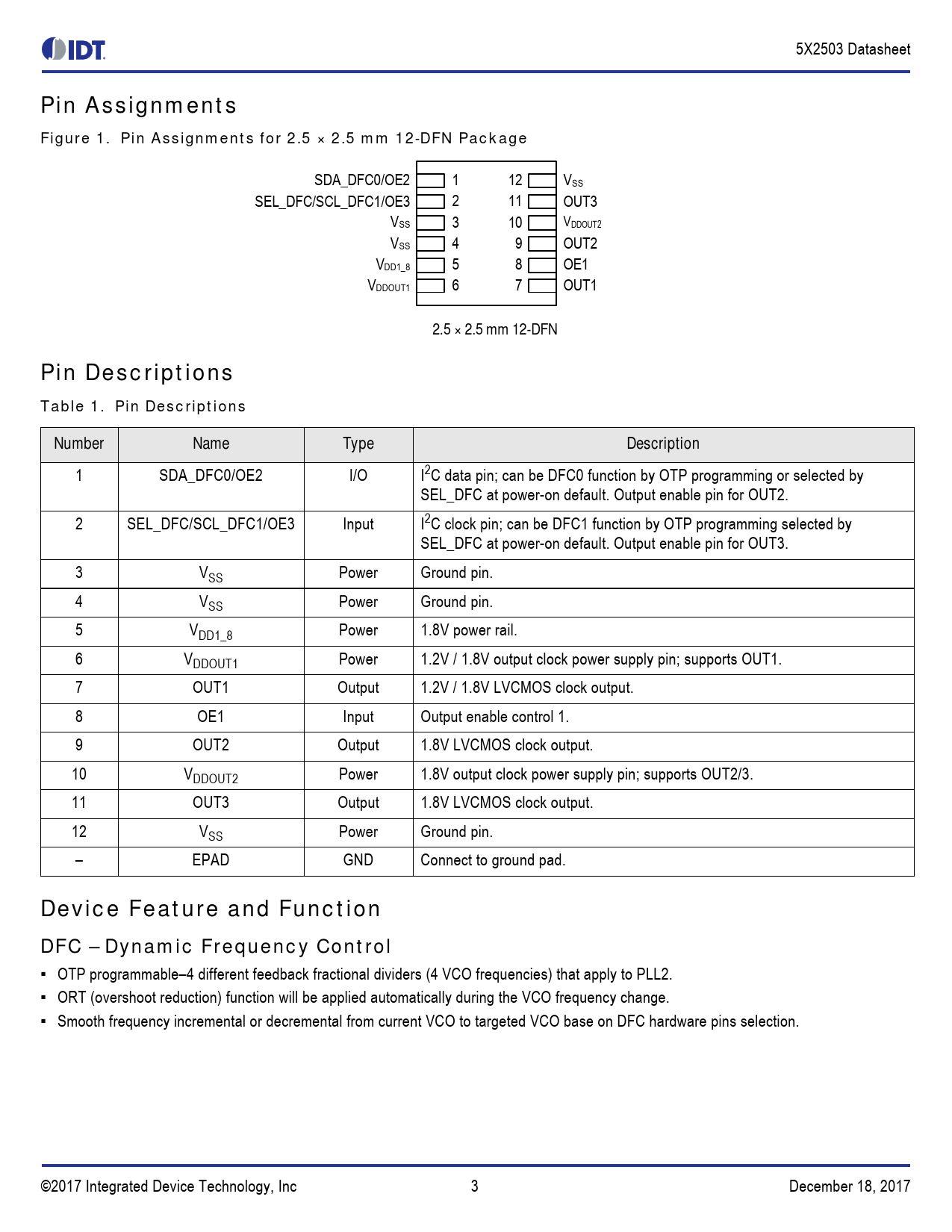 ▪ OTP programmable–4 different feedback fractional dividers (4 VCO frequencies) that apply to PLL2. ▪ ORT (overshoot reduction) function will be applied automatical y during the VCO frequency change. ▪ Smooth frequency incremental or decremental from current VCO to targeted VCO base on DFC hardware pins selection. ©2017 Integrated Device Technology, Inc 3 December 18, 2017 Document Outline Description Typical Applications Features Output Features Key Specifications Block Diagram Power Group Output Source Selection Register Setting Tables Pin Assignments Figure 1. Pin Assignments for 2.5 × 2.5 mm 12-DFN Package Pin Descriptions Table 1. Pin Descriptions Device Feature and Function DFC – Dynamic Frequency Control Figure 2. DFC Function Block Diagram Table 2. DFC Function Priority DFC Function Programming PPS – Proactive Power Saving Function Figure 3. PPS Function Block Diagram Figure 4. PPS Assertion/Deassertion Timing Chart PPS Function Programming Input Pin Function Table 3. OE1 Pin Function Table Table 4. SDA/SCL Function Selection Spread Spectrum ORT – VCO Overshoot Reduction Technology PLL Features and Descriptions Table 5. Output Divider 1 Table 6. Output Divider 2, 3, and 5 Table 7. Output Divider 4 Output Clock Test Conditions Figure 5. LVCMOS Output Clock Test Condition Absolute Maximum Ratings Table 8. Absolute Maximum Ratings Recommended Operating Conditions Table 9. Recommended Operating Conditions Input Capacitance, LVCMOS Output Impedance, and Internal Pull-down Resistance (TA = +25 °C) Table 10. Input Capacitance, LVCMOS Output Impedance, and Internal Pull-down Resistance Integrated Crystal Characteristics Table 11. Crystal Characteristics DC Electrical Characteristics Table 12. DC Electrical Characteristics 1,2 Electrical Characteristics–Input Parameters Table 13. Electrical Characteristics–Input Parameters 1 DC Electrical Characteristics for 1.8V LVCMOS Table 14. DC Electrical Characteristics – 1.8V LVCMOS AC Electrical Characteristics Table 15. AC Timing Electrical Characteristics – 32.768kHz Table 16. AC Timing Electrical Characteristics – 1.8V Table 17. AC Timing Electrical Characteristics, 1.2V / 1.8V I2C Bus DC Characteristics Table 18. I2C Bus DC Characteristics Table 19. I2C Bus AC Characteristics Spread Spectrum Generation Specifications Table 20. Spread Spectrum Generation Specifications General SMBus Serial Interface Information Package Outline Drawings Figure 6. NDG12 Package Drawing – page 1 Figure 7. NDG12 Package Drawing – page 2 Ordering Information Marking Diagram Revision History